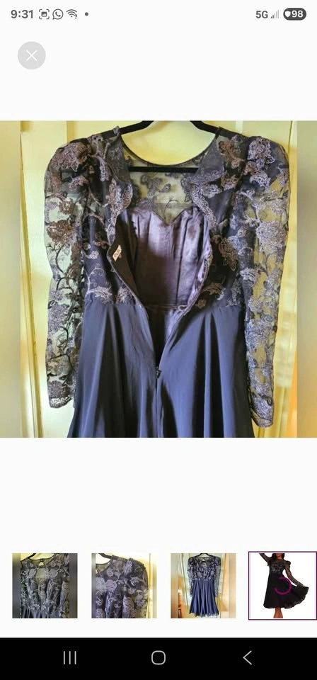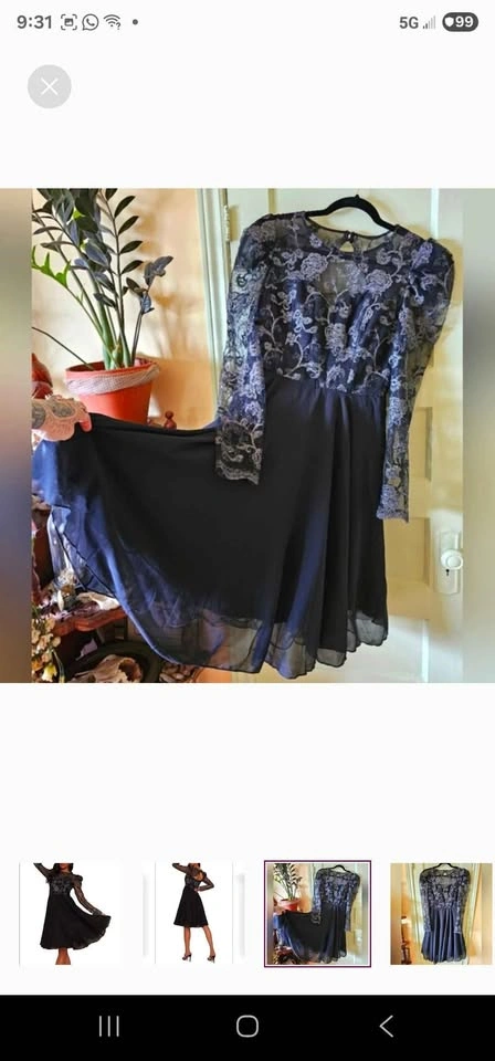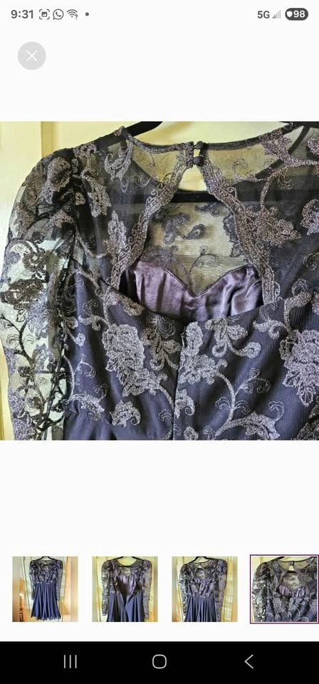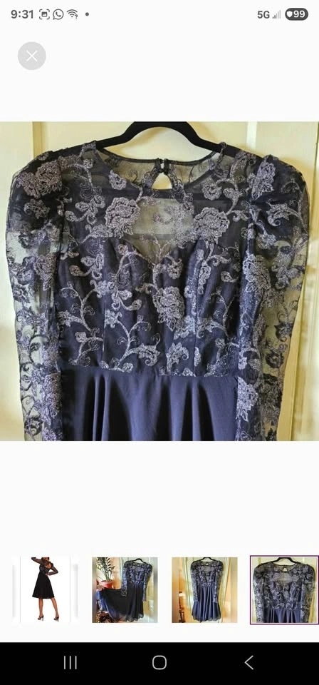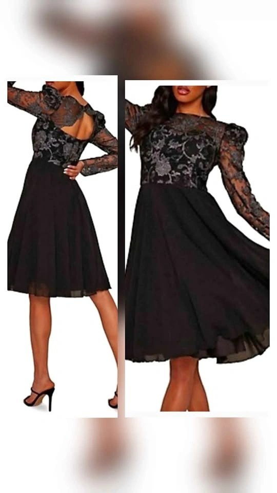 Amazing semi-formal long sleeve A-line dress from Chi Chi London! Top of dress is black mesh with fancy embroidery of roses and swirls in gunmetal silver. Skirt section of dress is black chiffon, with a tulle underskirt for volume. Long mesh puff sleeves with some tulle at the shoulders to hold the puffed shape. Skirt is fully lined, and top section is lined to above the chest with a sweetheart shape to the lining. No padding, but the material is thick enough that it won't show any nip if worn without a bra. Dress closes with a hidden rear zipper and two buttons below the nape of the neck. The back has a gorgeous cutout section under the buttons.