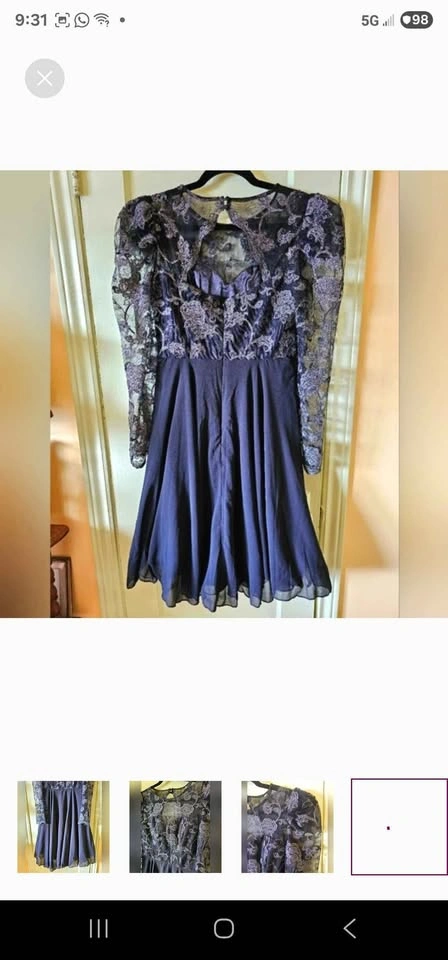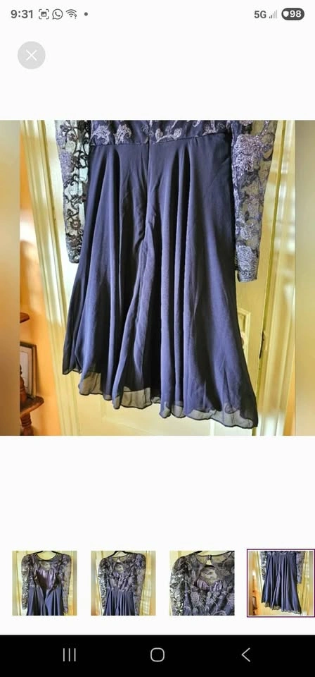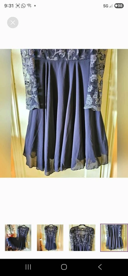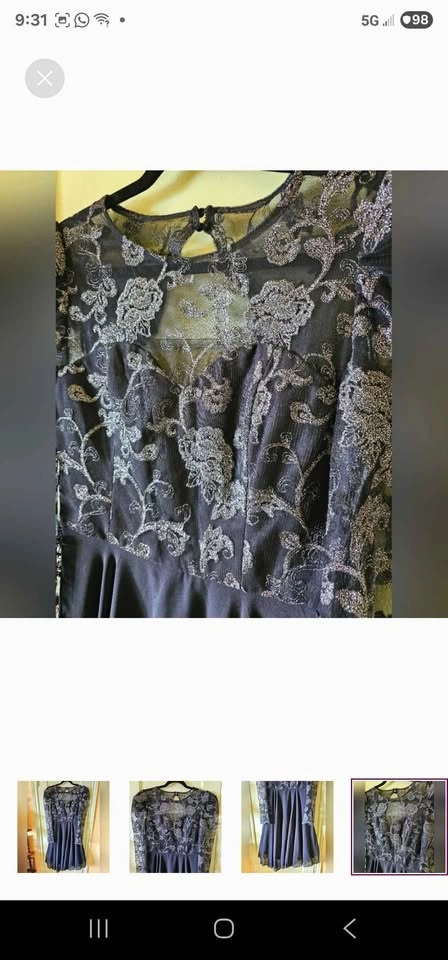 Amazing semi-formal long sleeve A-line dress from Chi Chi London! Top of dress is black mesh with fancy embroidery of roses and swirls in gunmetal silver. Skirt section of dress is black chiffon, with a tulle underskirt for volume. Long mesh puff sleeves with some tulle at the shoulders to hold the puffed shape. Skirt is fully lined, and top section is lined to above the chest with a sweetheart shape to the lining. No padding, but the material is thick enough that it won't show any nip if worn without a bra. Dress closes with a hidden rear zipper and two buttons below the nape of the neck. The back has a gorgeous cutout section under the buttons.