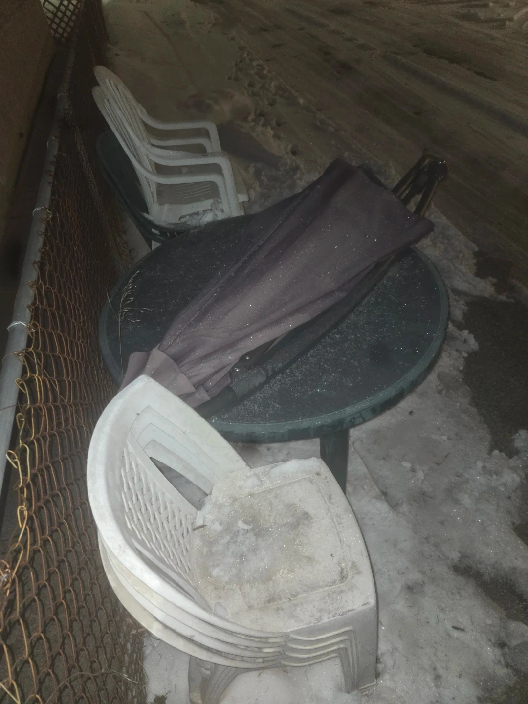 Stack of four white plastic patio chairs and a dark green patio table. Chairs are white plastic with a slatted design. Table is round and dark green. Includes a folded patio umbrella.