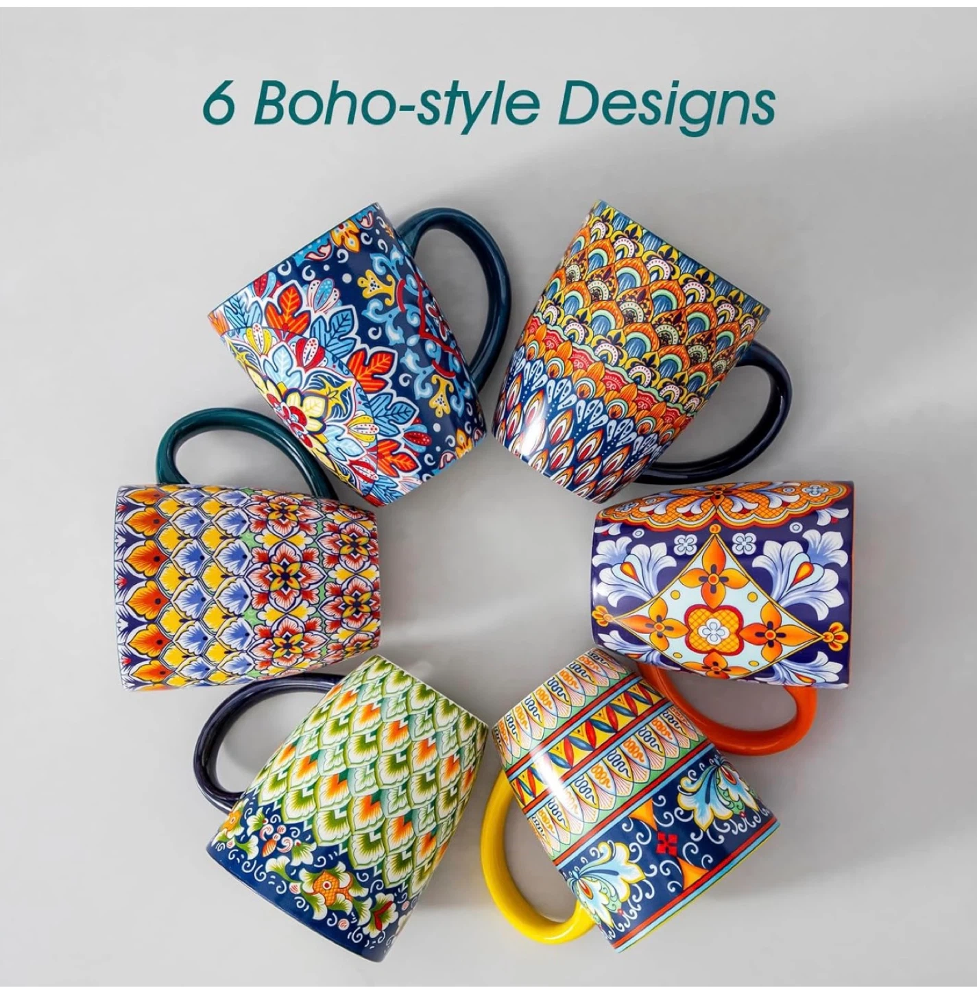 Set of 6 Ceramic Mugs with Boho-style Designs