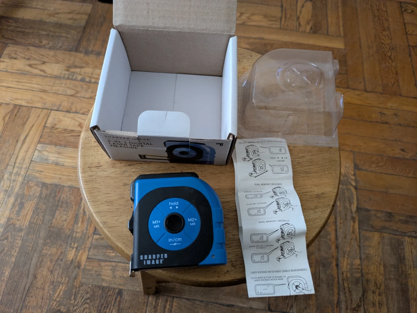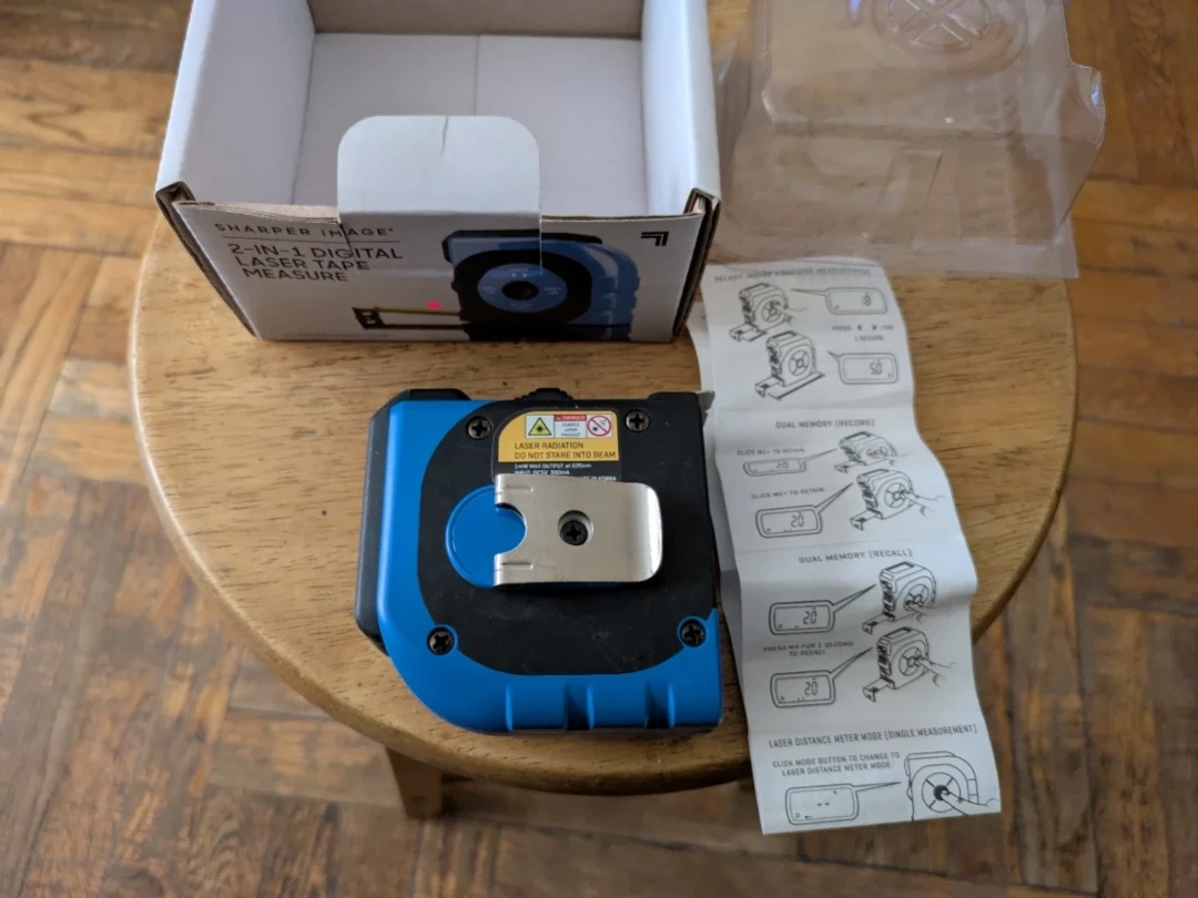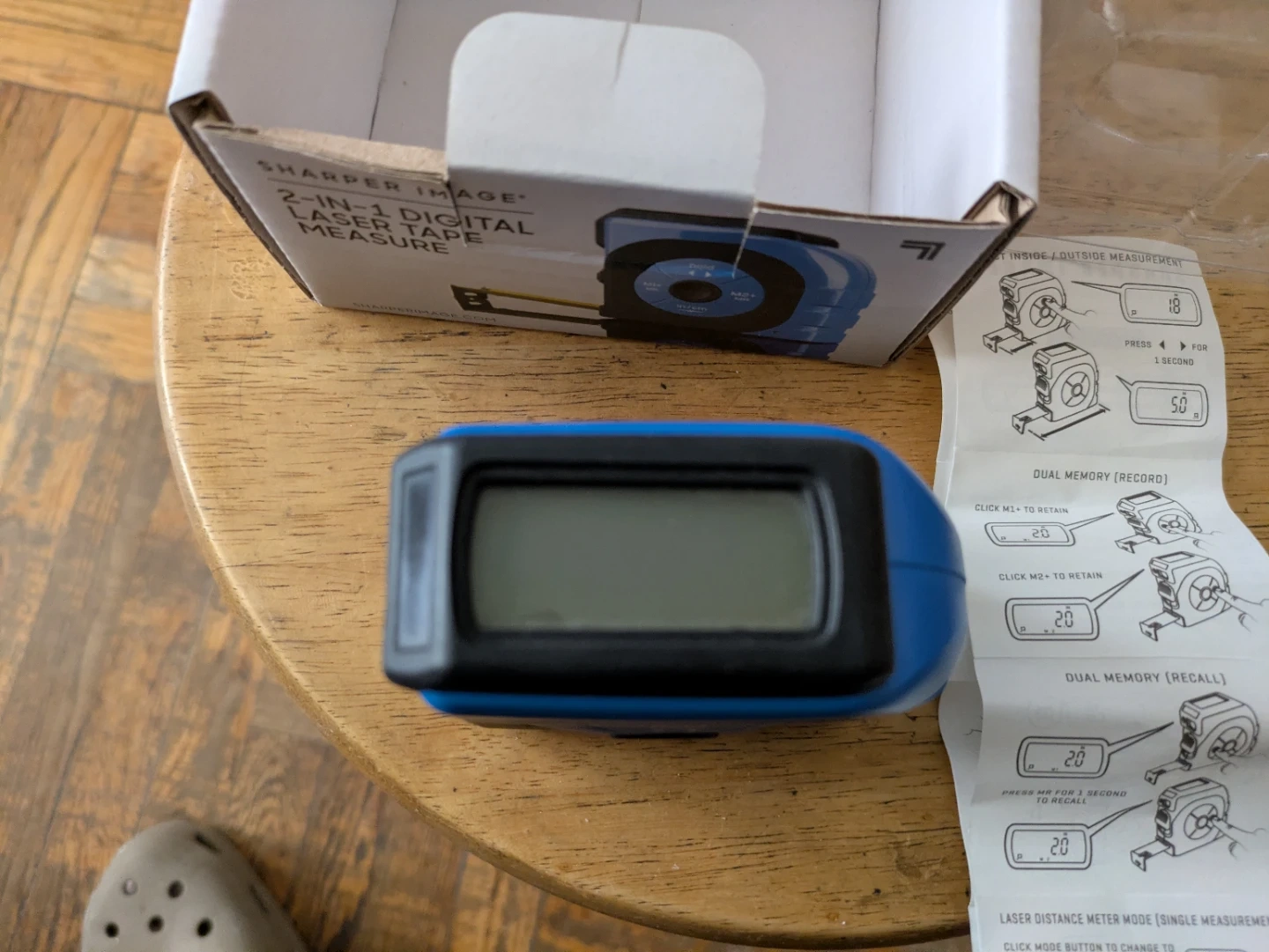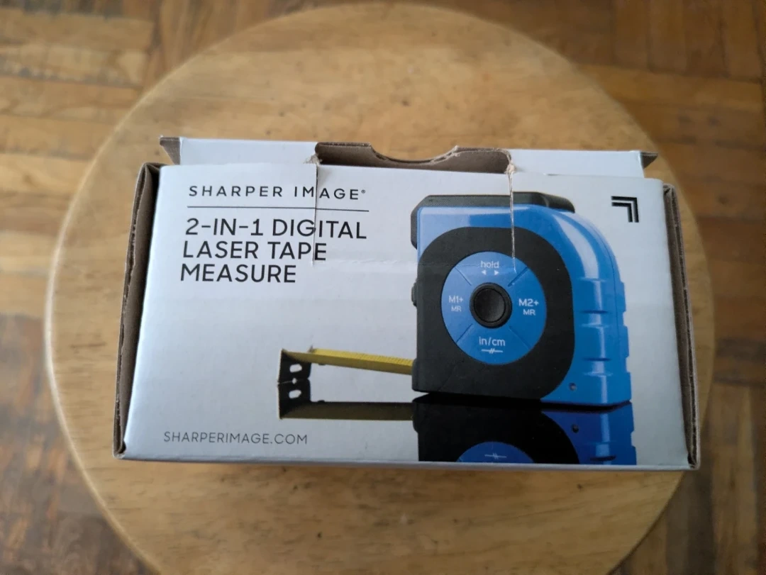 This is a digital tape measure from Sharper Image. It features memory functions M1+ and M2+ for storing measurements. The display can show measurements in both inches and centimeters.