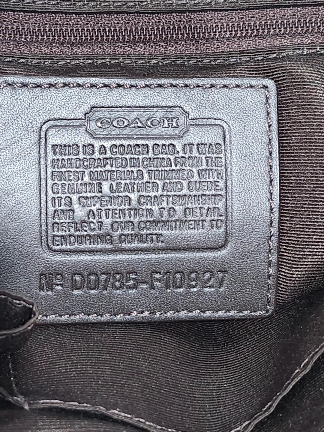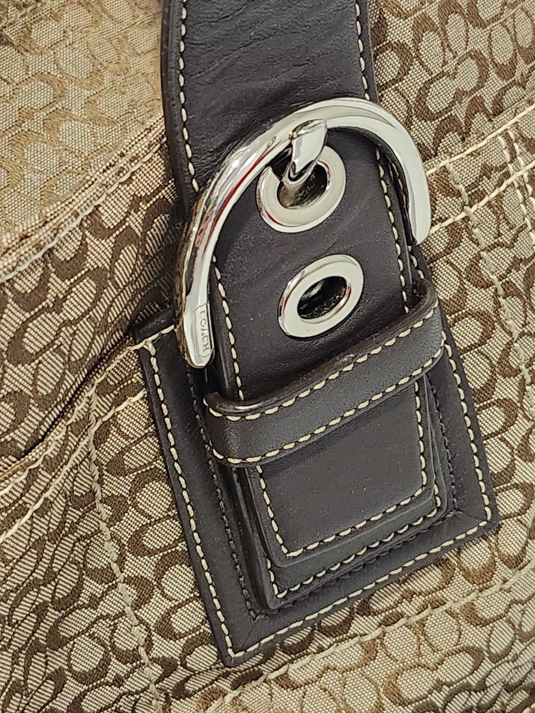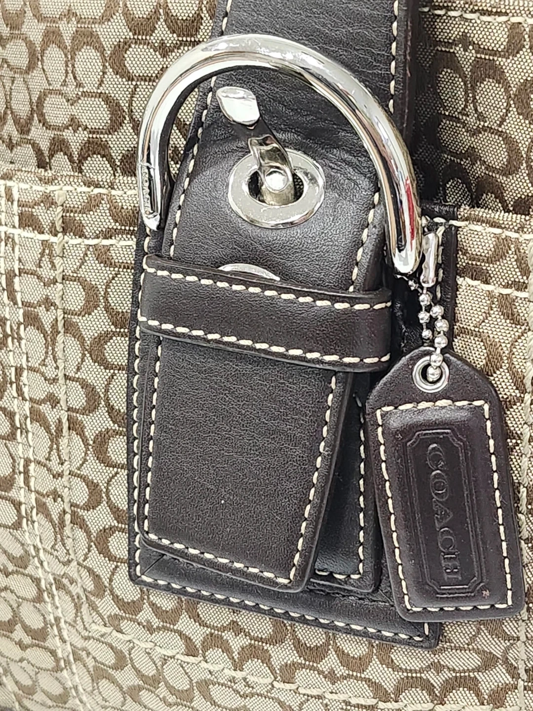 A classic Coach tote bag. It has dark brown leather handles and trim. This bag is perfect for everyday use!
