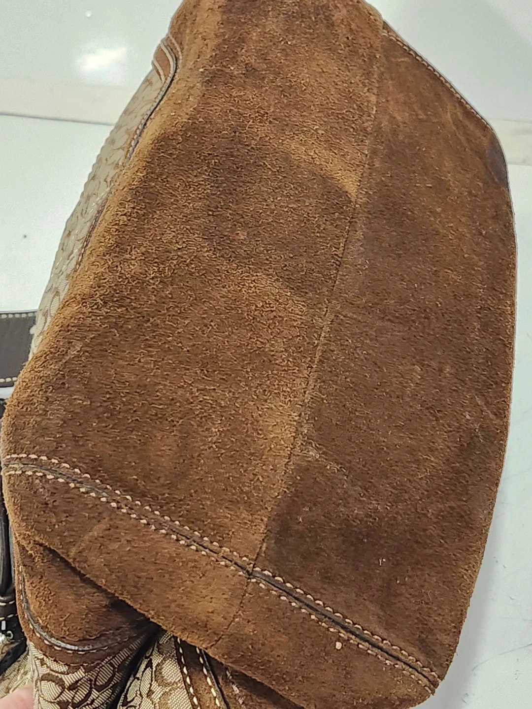 Design: The bag showcases a suede or leather base and wide leather shoulder straps accented with silver-tone buckle hardware.