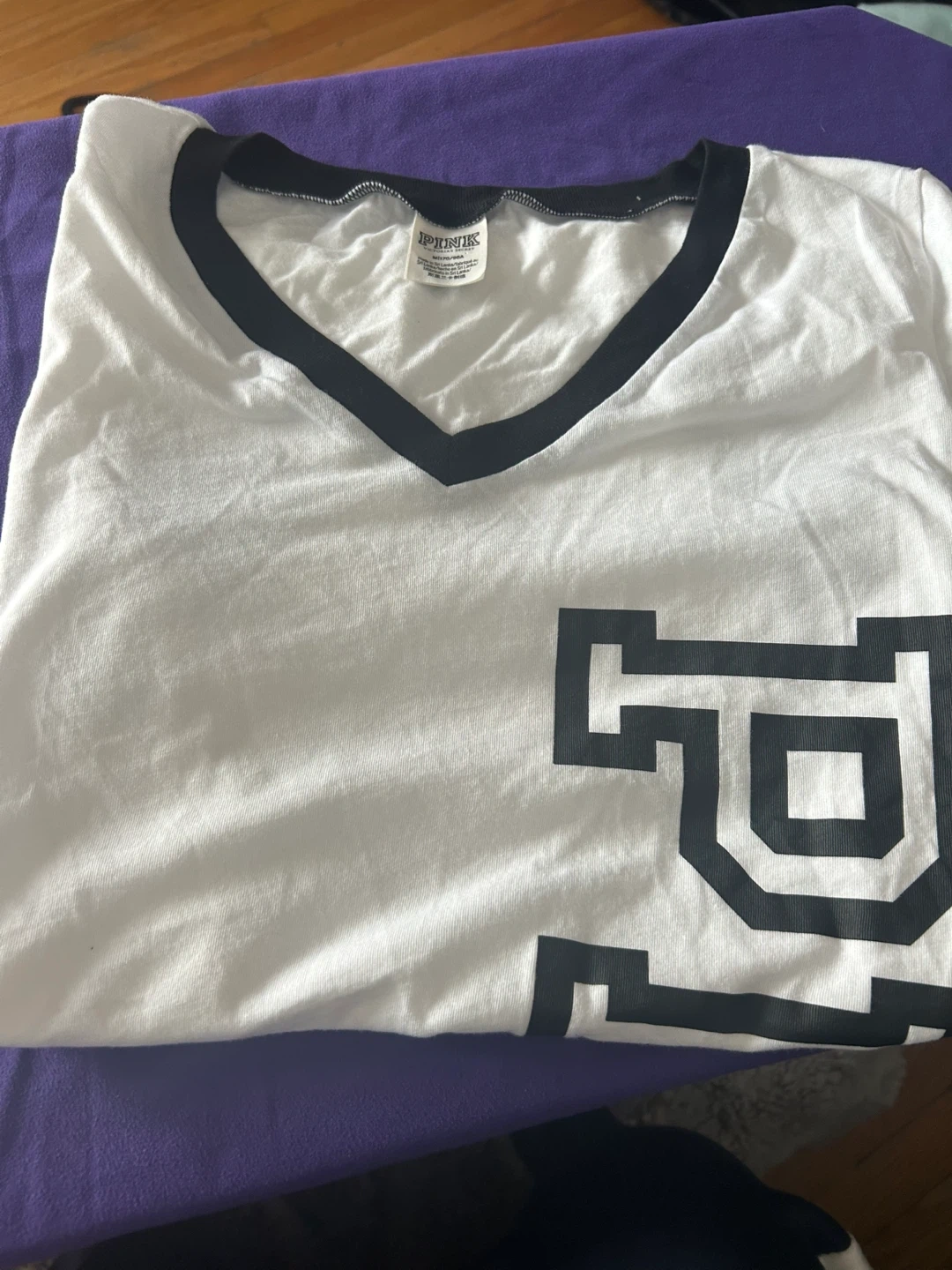 This is a white V-neck t-shirt from PINK Victoria's Secret. It features black trim on the neckline and sleeve cuffs, with 'PINK' repeated on the sleeve bands. The shirt is size M and made in Sri Lanka.