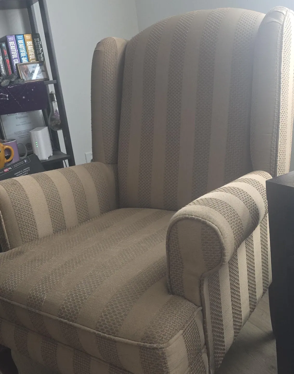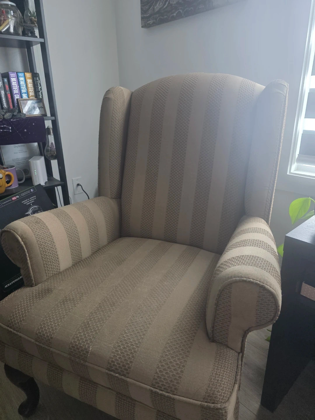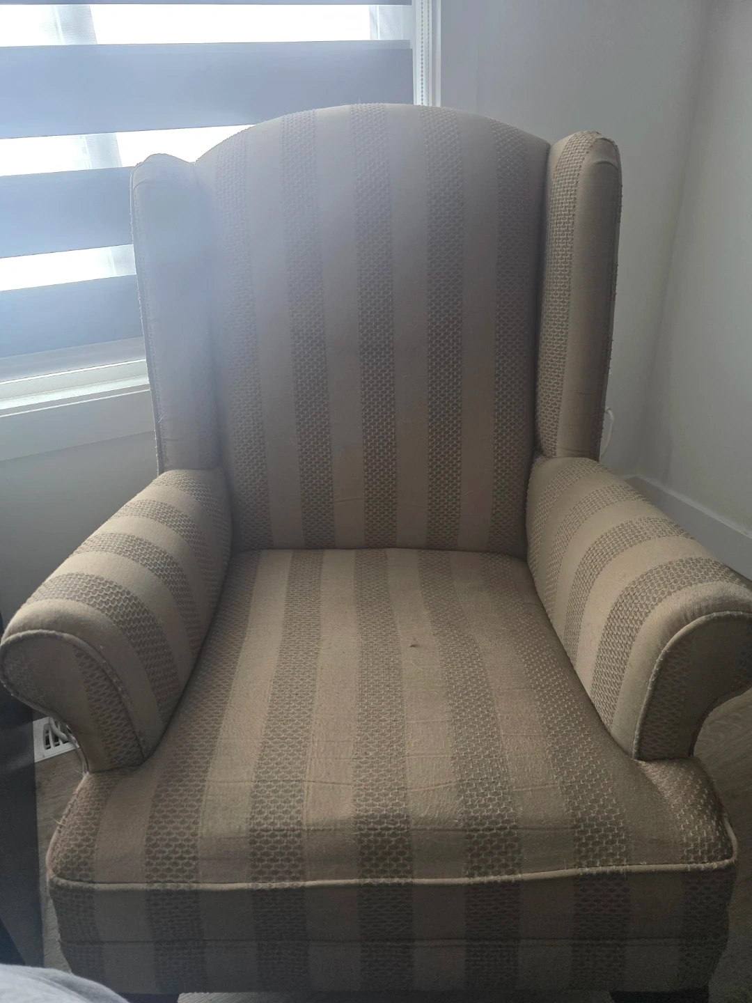 2 Comfortable armchair with a striped fabric upholstery. This chair features a high back and rolled arms, offering a cozy spot to relax. Upholstered in a neutral beige and brown stripe pattern.