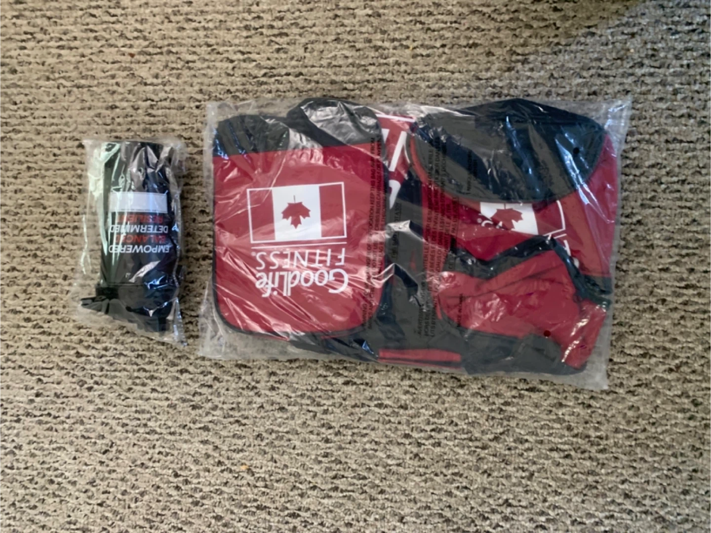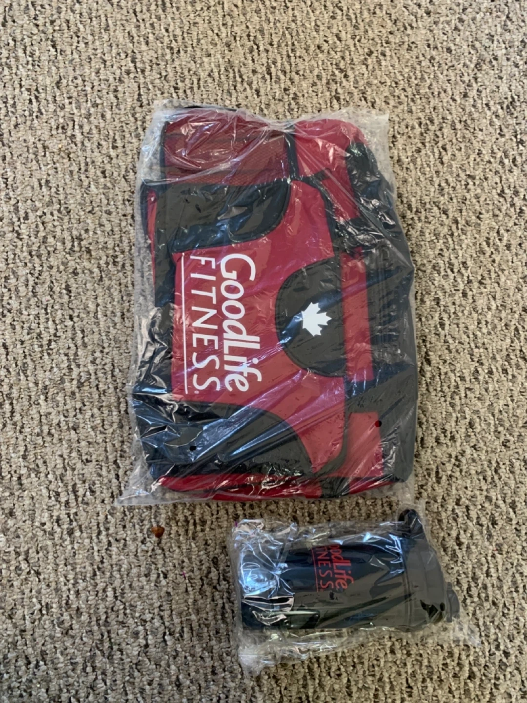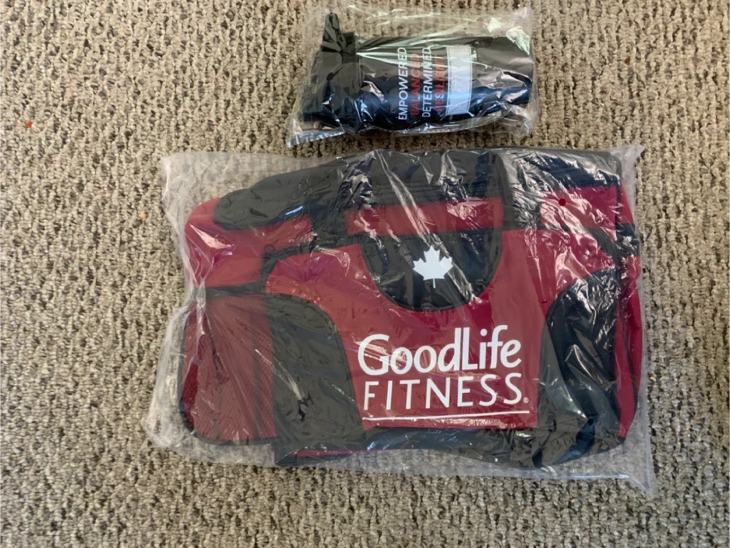 Selling a brand new GoodLife Fitness gym bag and shaker bottle! The bag is red and black with the GoodLife Fitness logo and a Canadian flag. The shaker bottle is also included, perfect for staying hydrated during your workouts