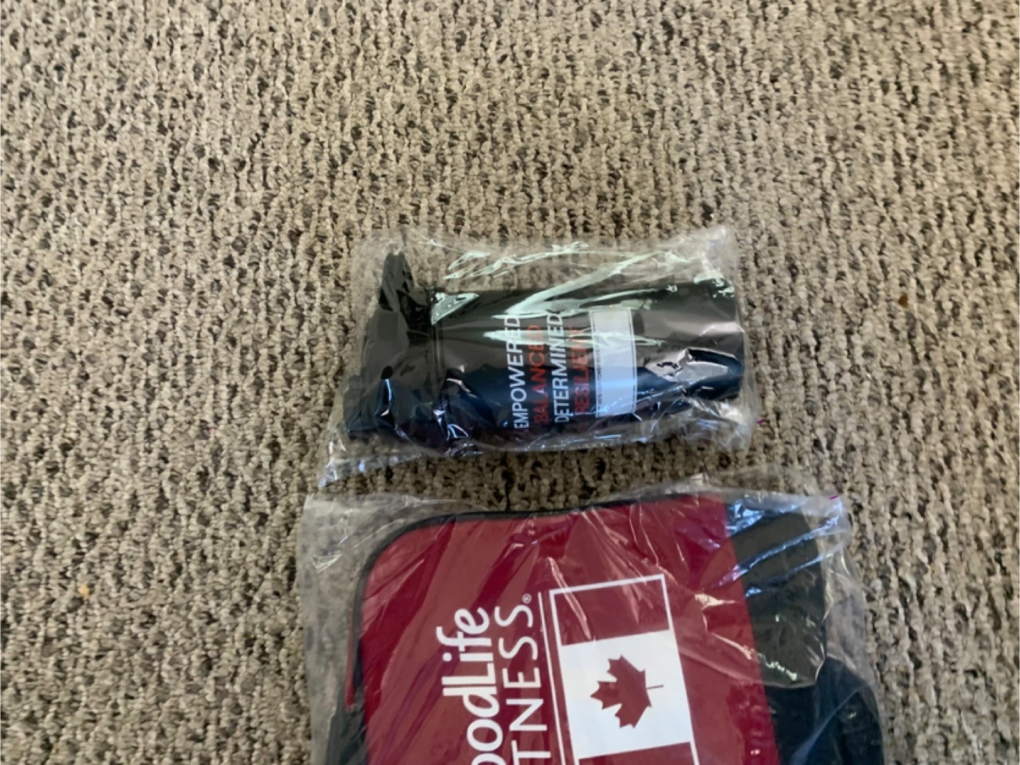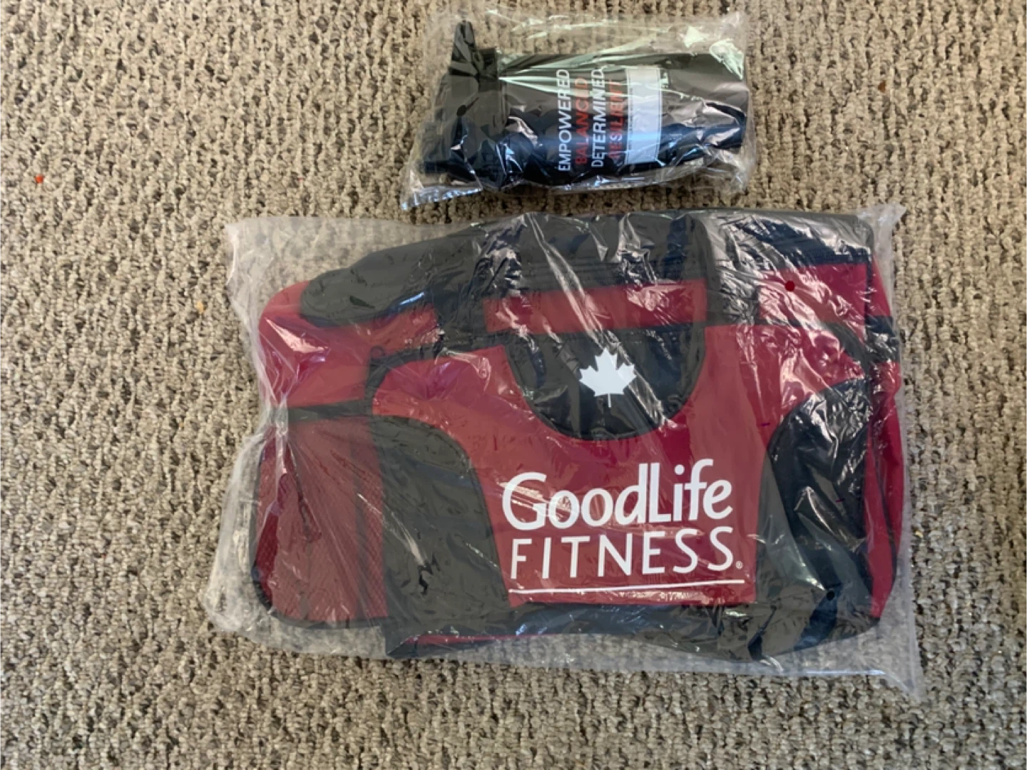 Selling a brand new GoodLife Fitness gym bag and shaker bottle! The bag is red and black with the GoodLife Fitness logo and a Canadian flag. The shaker bottle is also included, perfect for staying hydrated during your workouts