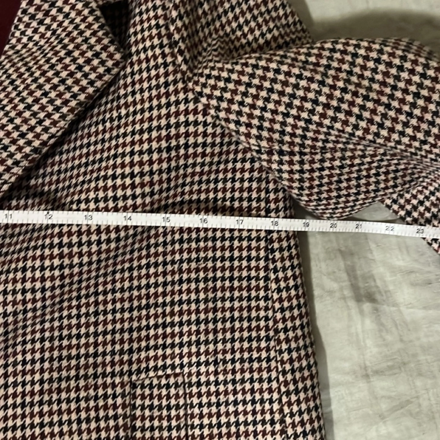 Adorable set, unfortunately too small for me now. Navy, maroon and beige. Coat measures approximately 33-34" from shoulder to hem in length. In great condition with little to no signs of wear. Paid over $200 plus tax