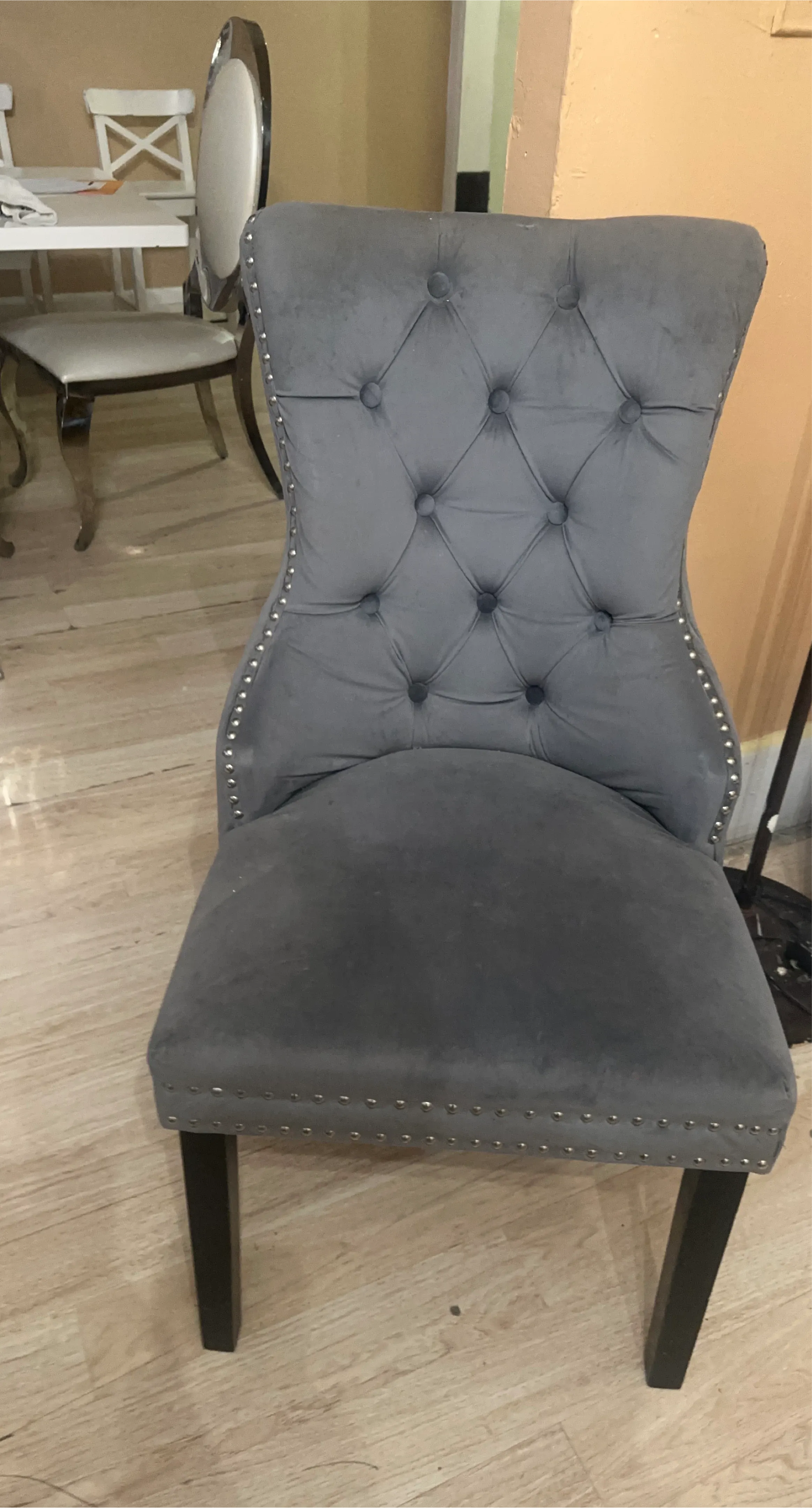 Tufted upholstered dining chair in a gray velvet fabric. It has a diamond-stitched back and silver nailhead trim. The legs are solid black wood.