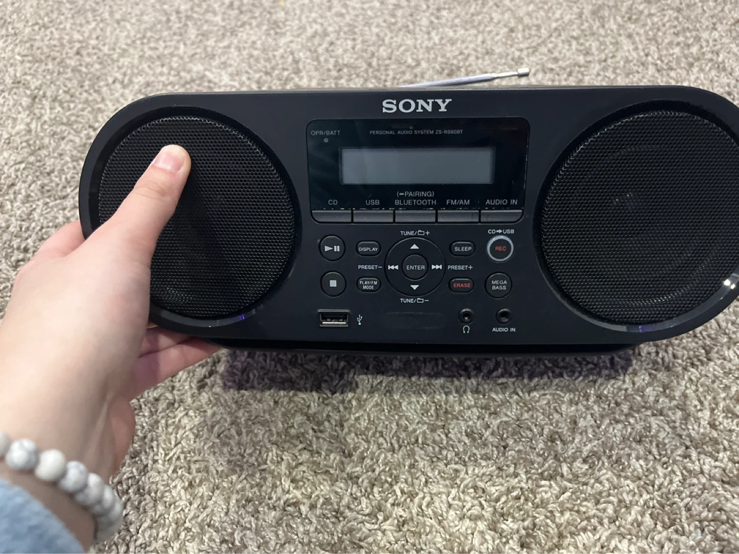 This black Sony Personal Audio System features a CD player, AM/FM radio, and Bluetooth connectivity. It includes a USB port and an audio-in jack. The device has preset buttons for favorite radio stations.