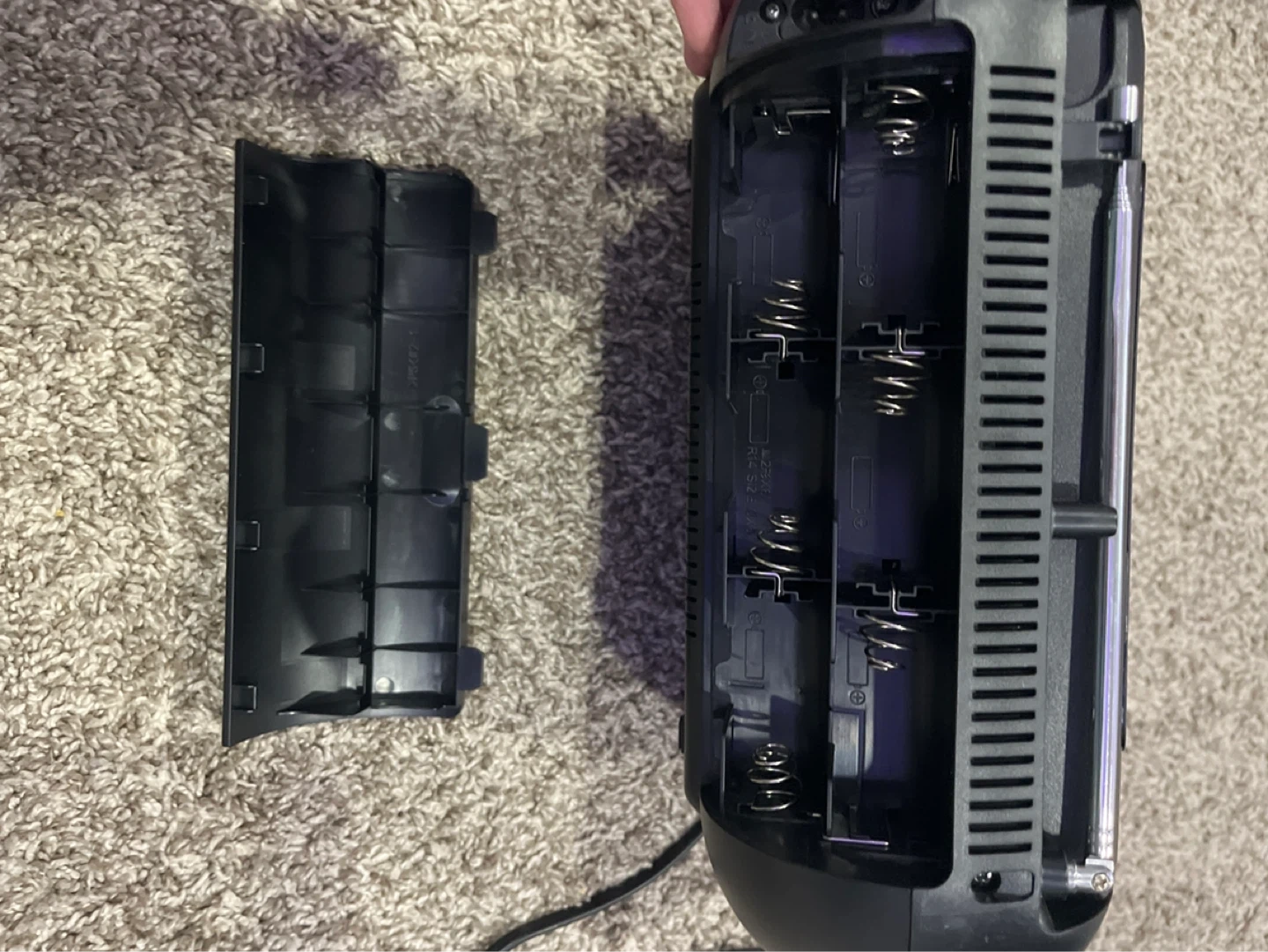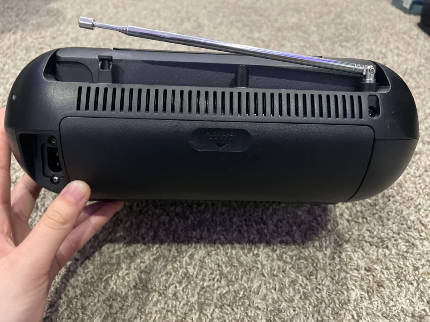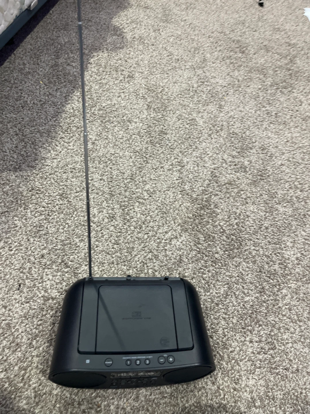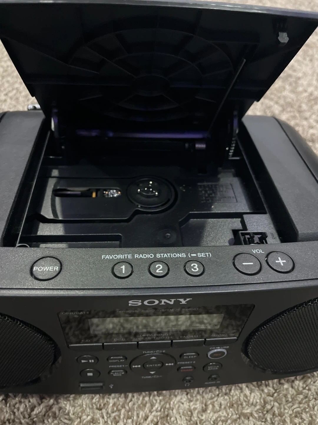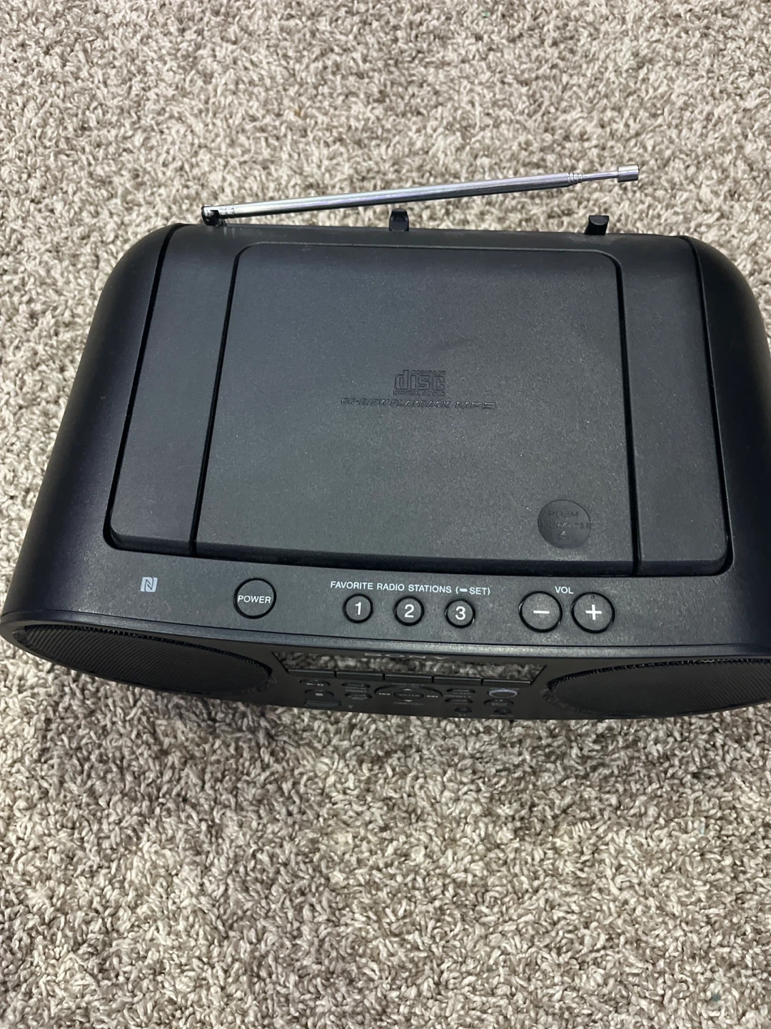 This black Sony Personal Audio System features a CD player, AM/FM radio, and Bluetooth connectivity. It includes a USB port and an audio-in jack. The device has preset buttons for favorite radio stations.