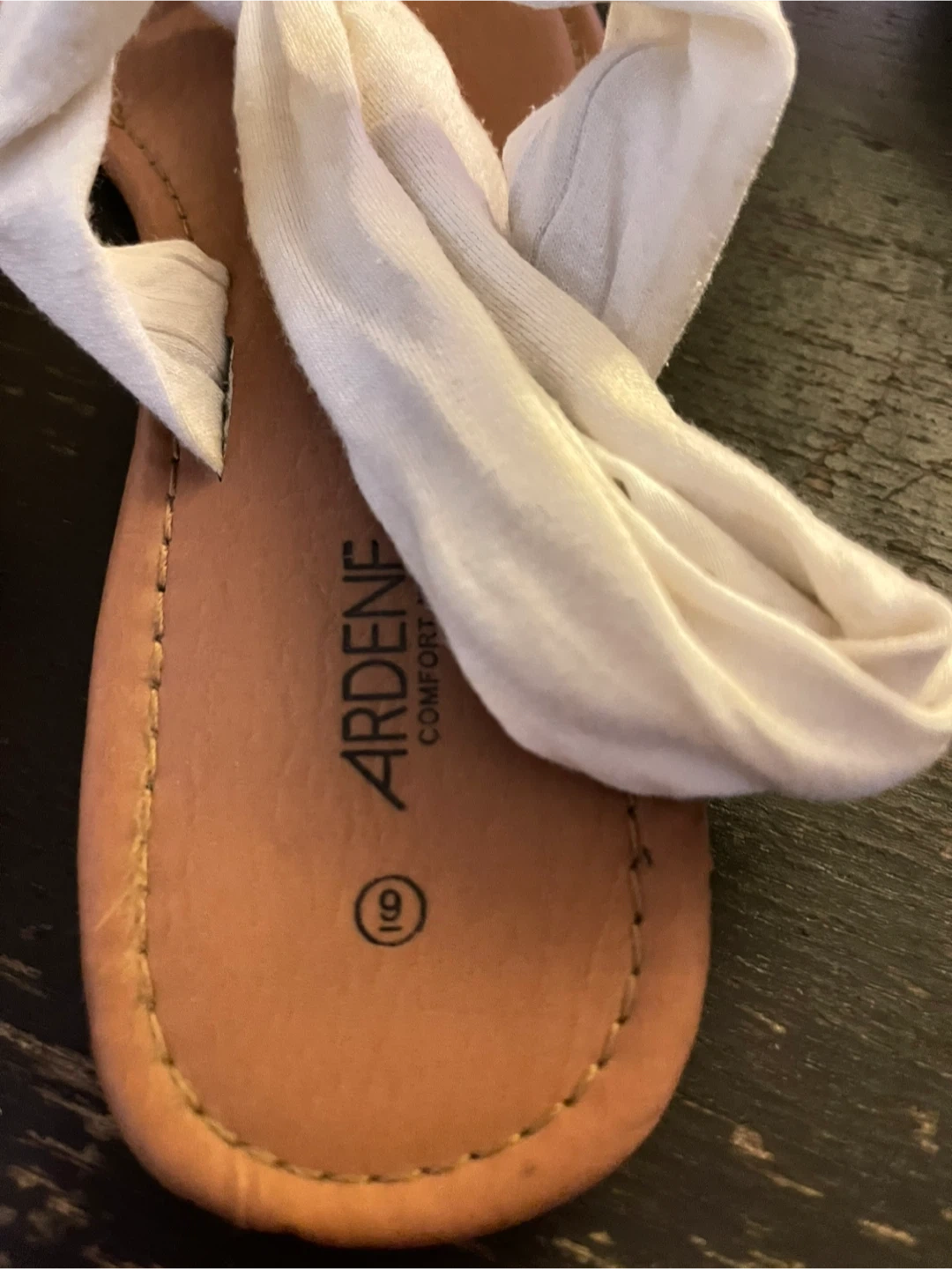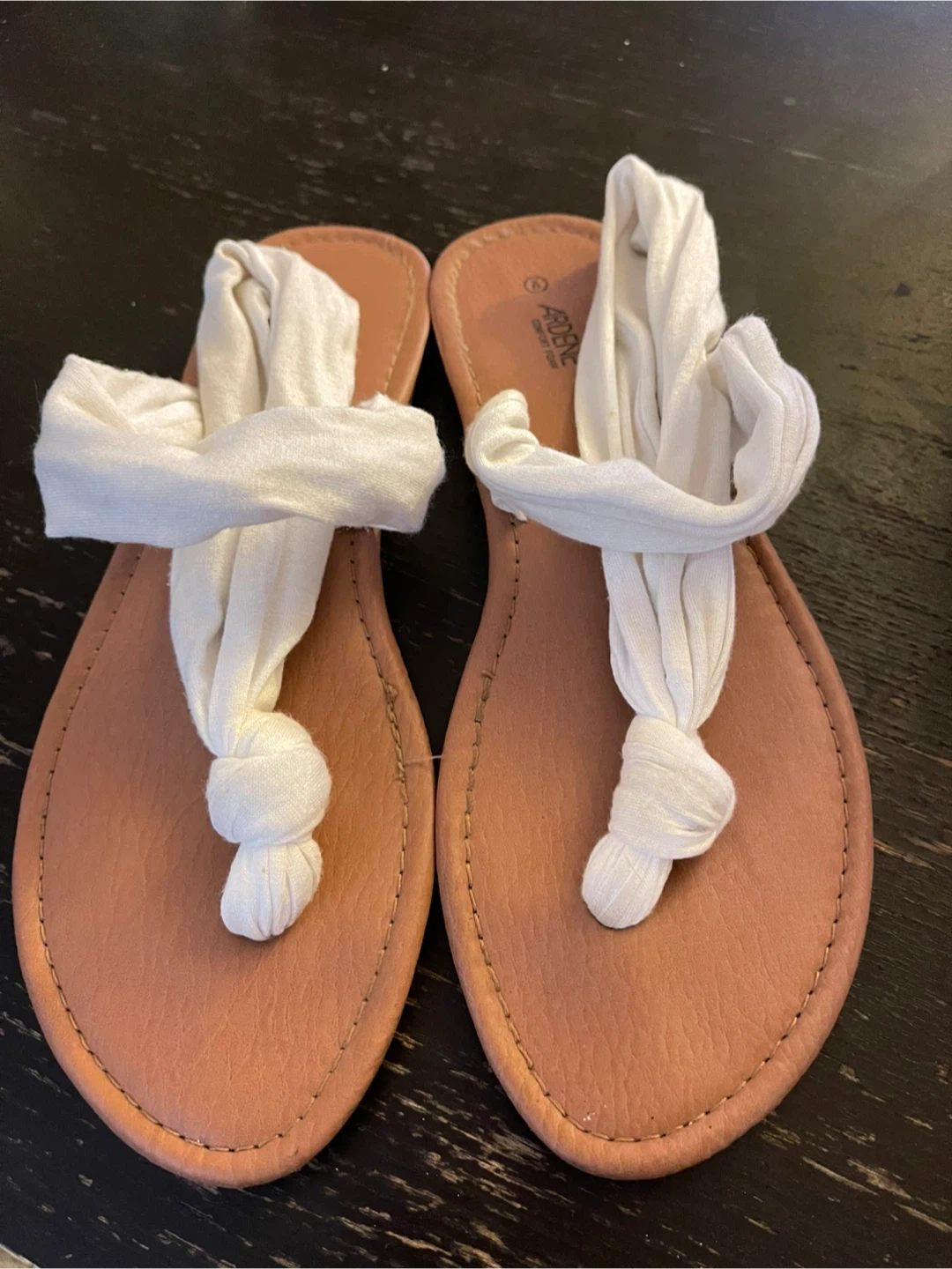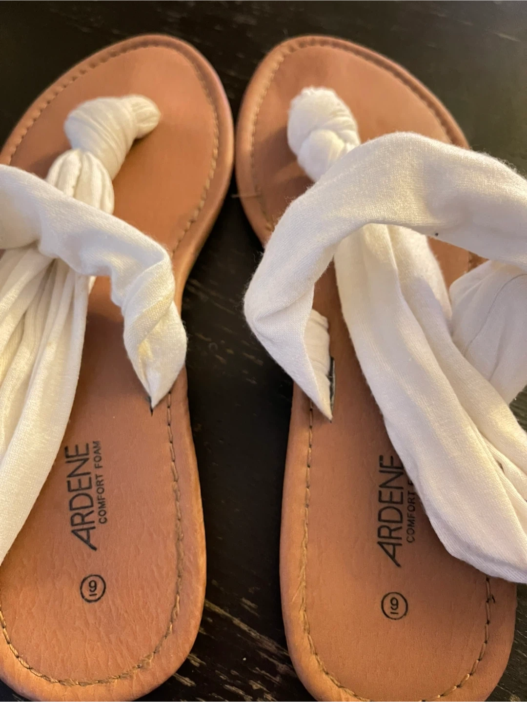 These are a pair of Ardene comfort foam sandals in a size 9. They feature a white fabric detail on the top