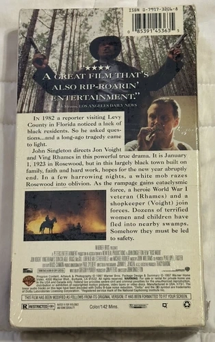 In 1982, a reporter visiting Levy County, Florida, noticed a lack of Black residents. He asked questions, and a long-ago tragedy came to light. John Singleton directs Jon Voight and Ving Rhames in this powerful true drama. It is January 1, 1923, in Rosewood, a largely Black town built on family, faith, and hard work. Hopes for the new year abruptly end when, in a few harrowing nights, a white mob razes Rosewood into oblivion. As the rampage gains cataclysmic force, a heroic World War I veteran (Rhames) and a shopkeeper (Voight) join forces to lead dozens of terrified women and children, who have fled into nearby swamps, to safety.