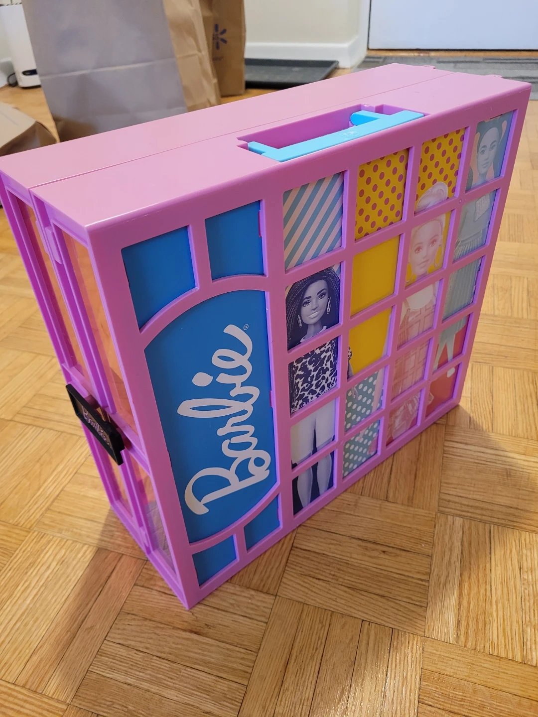 This is a pink foldable Barbie closet playset. Comes with 3 set of Barbie clothing, shoes and bags + some other stuffs.