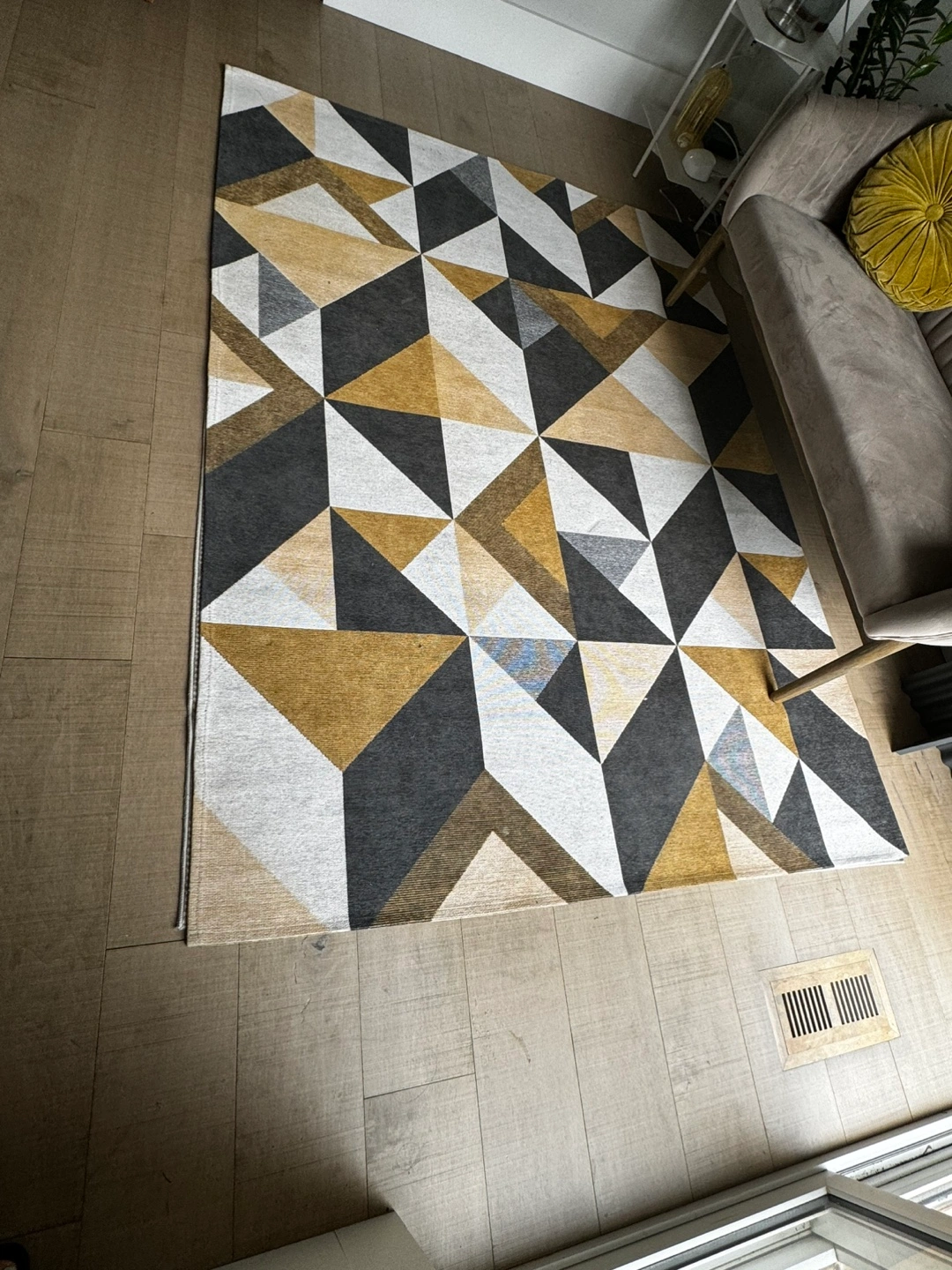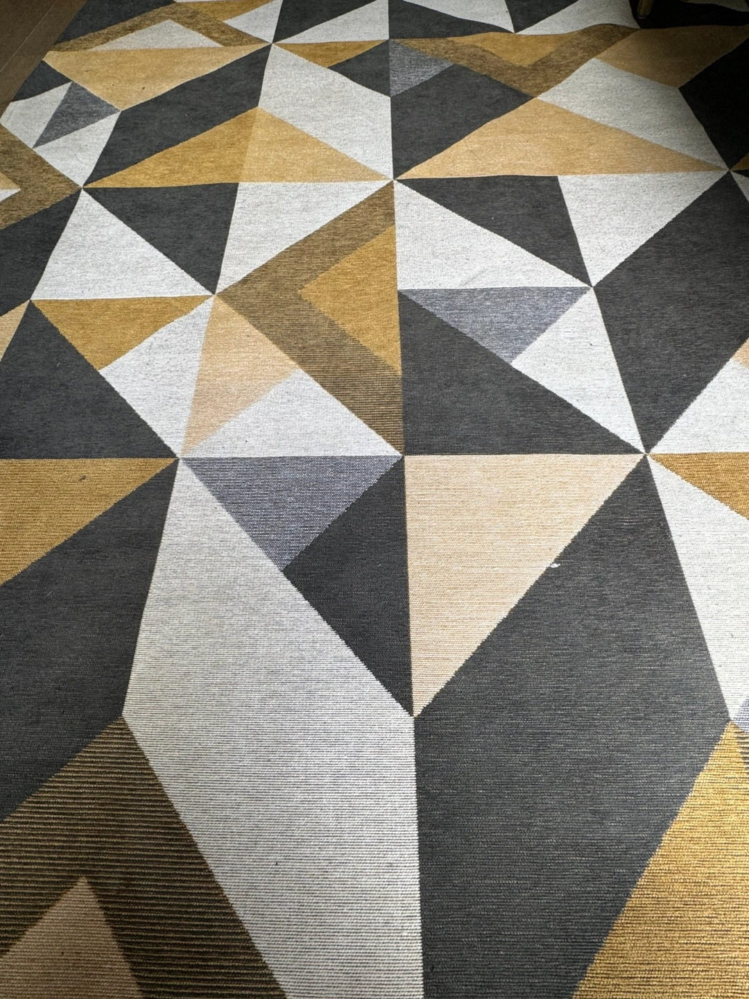 #ThriftyPicks Area rug with a geometric pattern in grey, mustard, and white. Used for a show room. No stains or marks, practically new!!