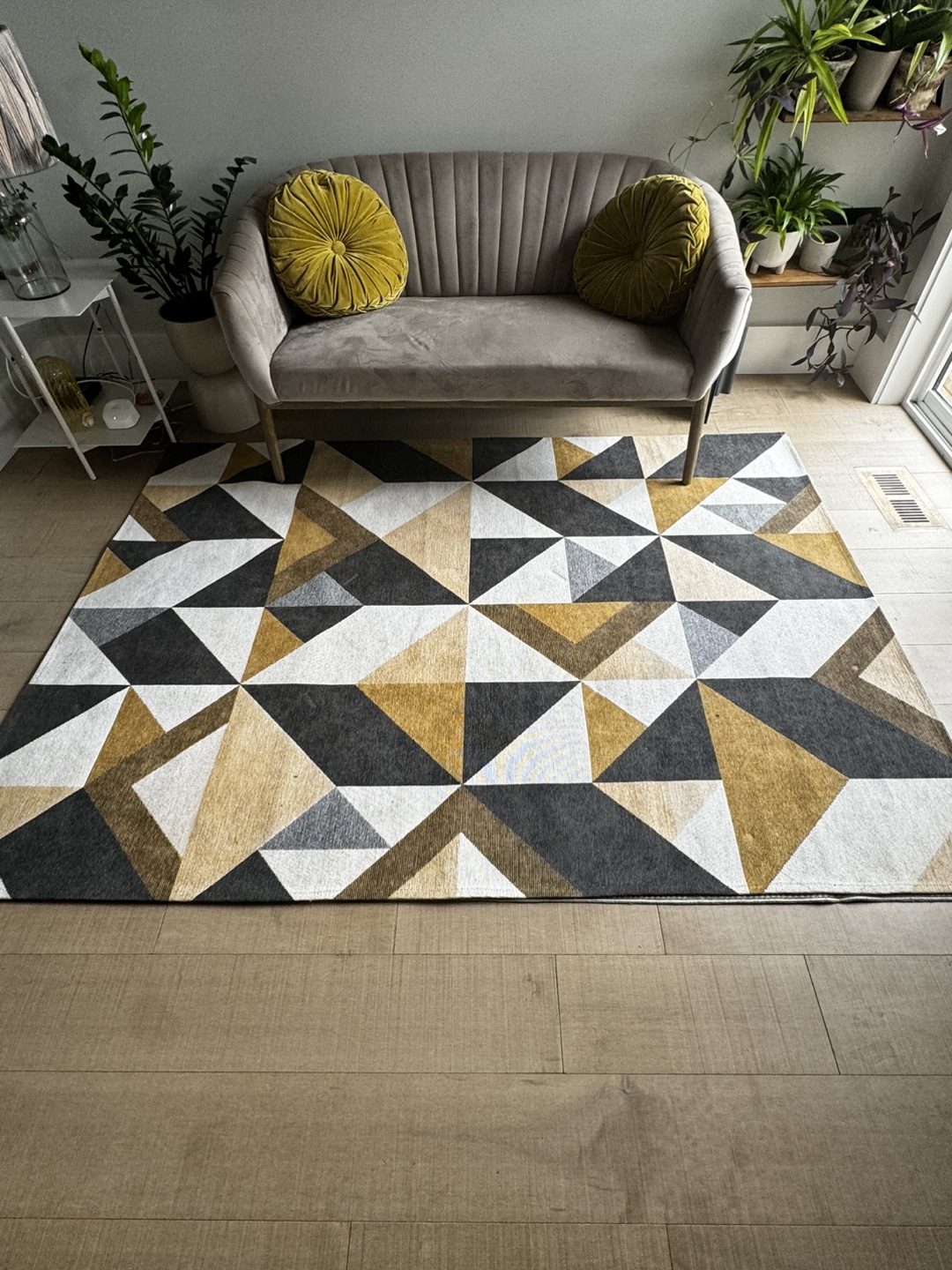 #ThriftyPicks Area rug with a geometric pattern in grey, mustard, and white. Used for a show room. No stains or marks, practically new!!