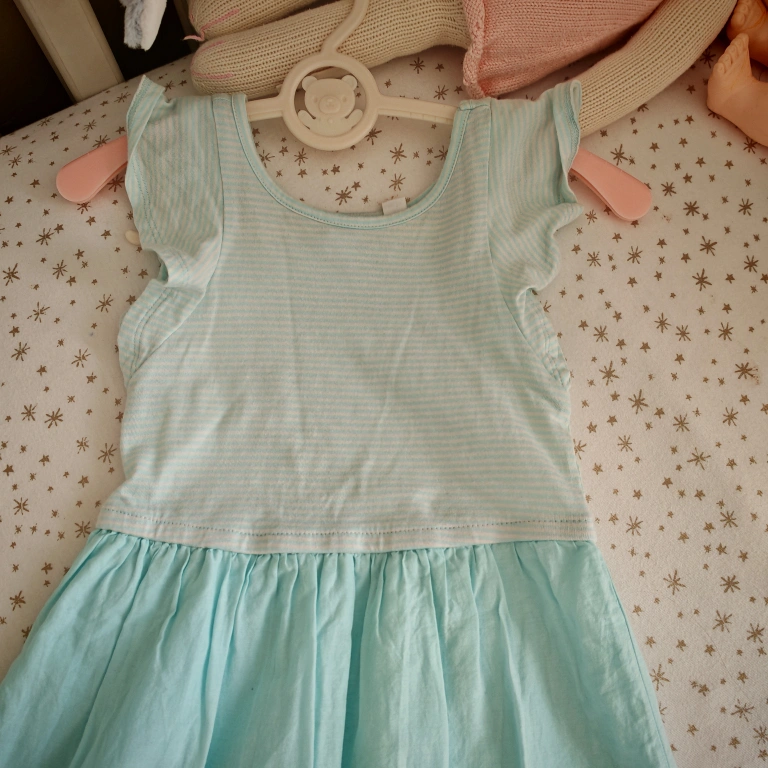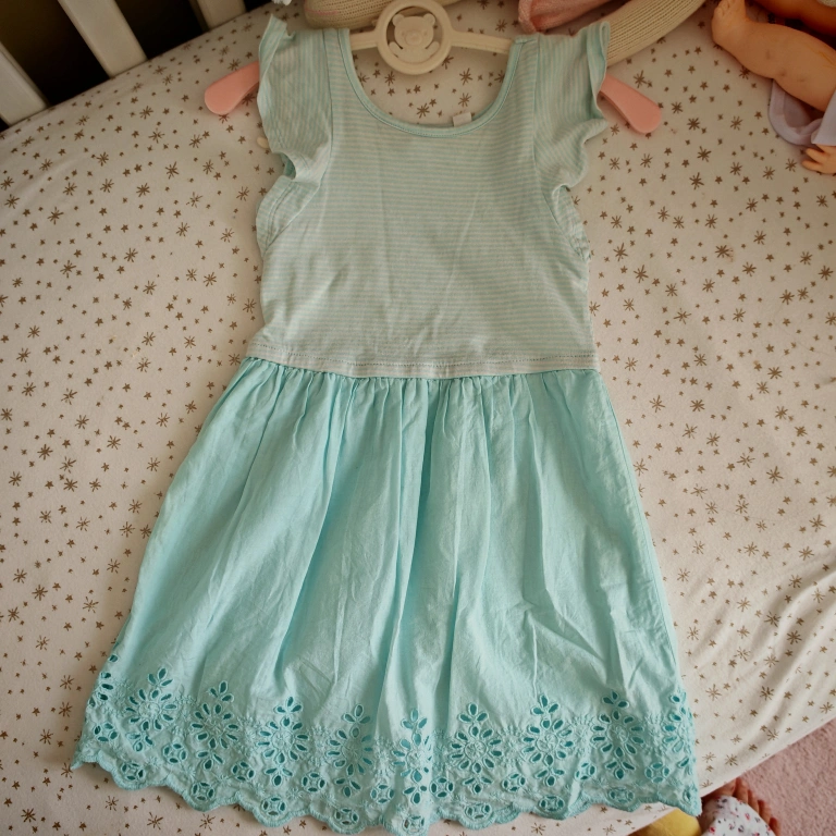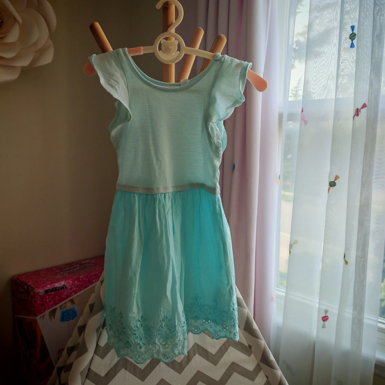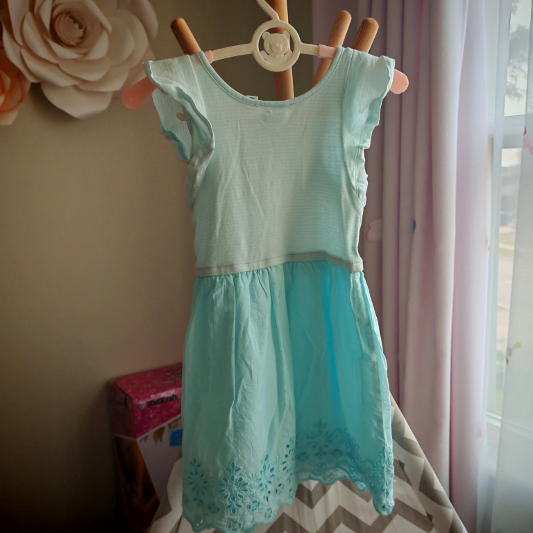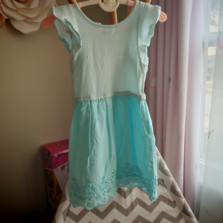 This adorable girls' dress from GAP is a lovely light blue colour and size XS. It features a cute embroidered hem and is perfect for spring or summer! It's in great condition and ready for a new home