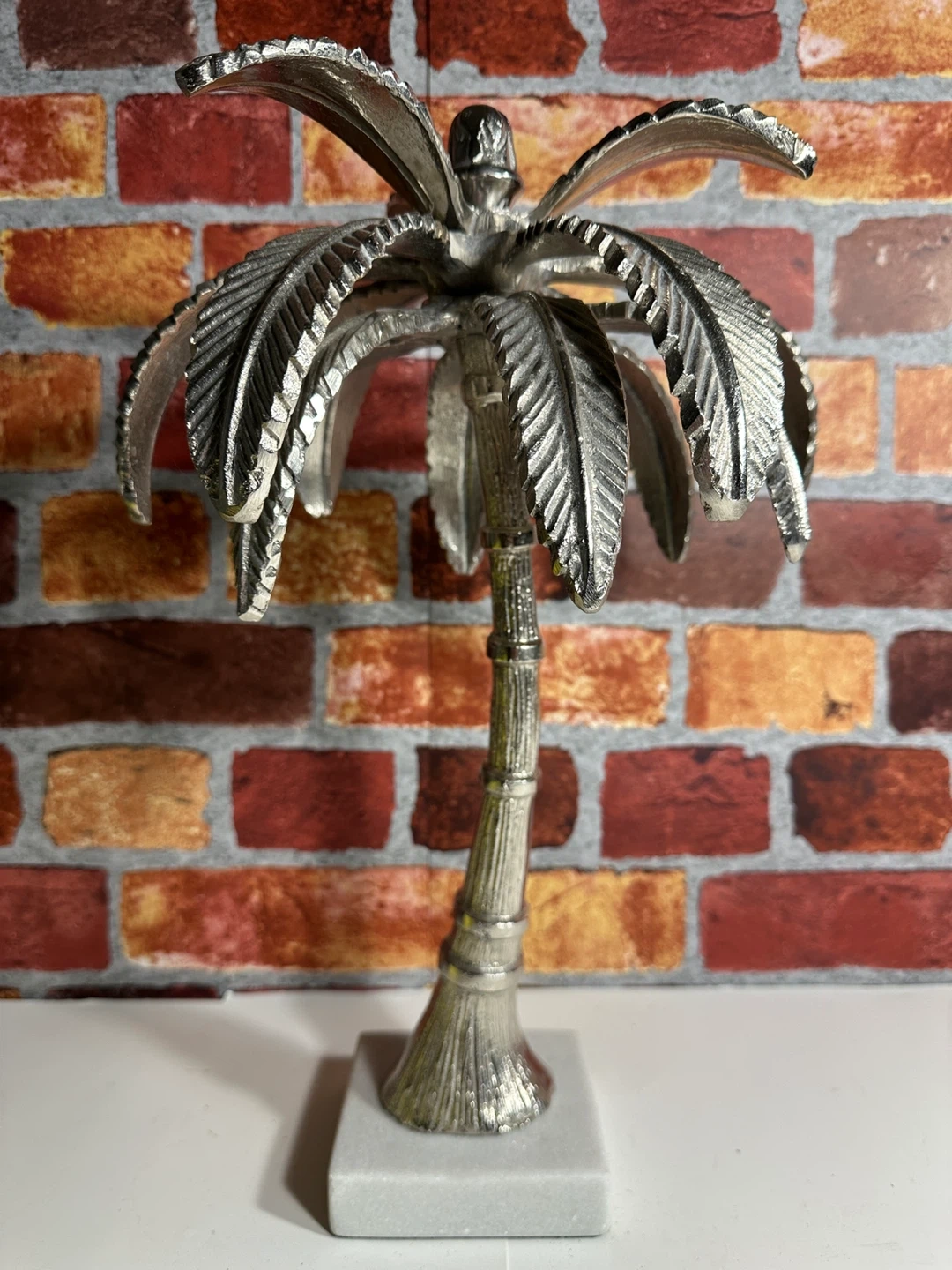 Decorative palm tree sculpture. It's made of a silver-toned metal with detailed leaves and trunk. It rests on a solid white marble base. Adds a touch of tropical flair to any space!