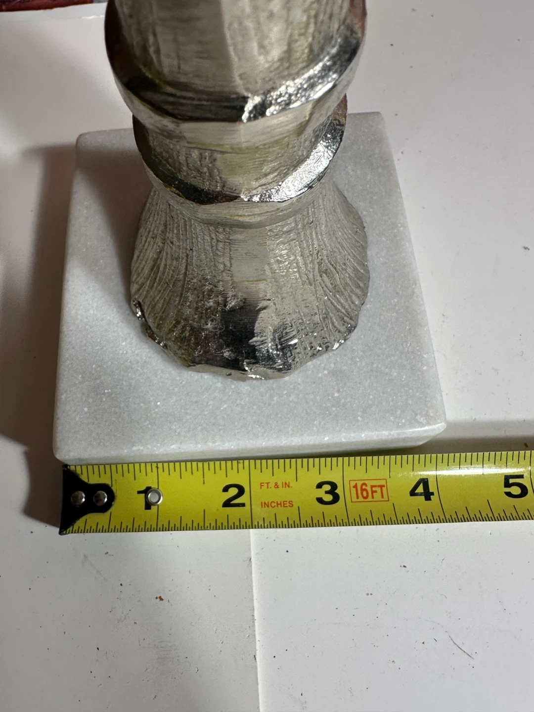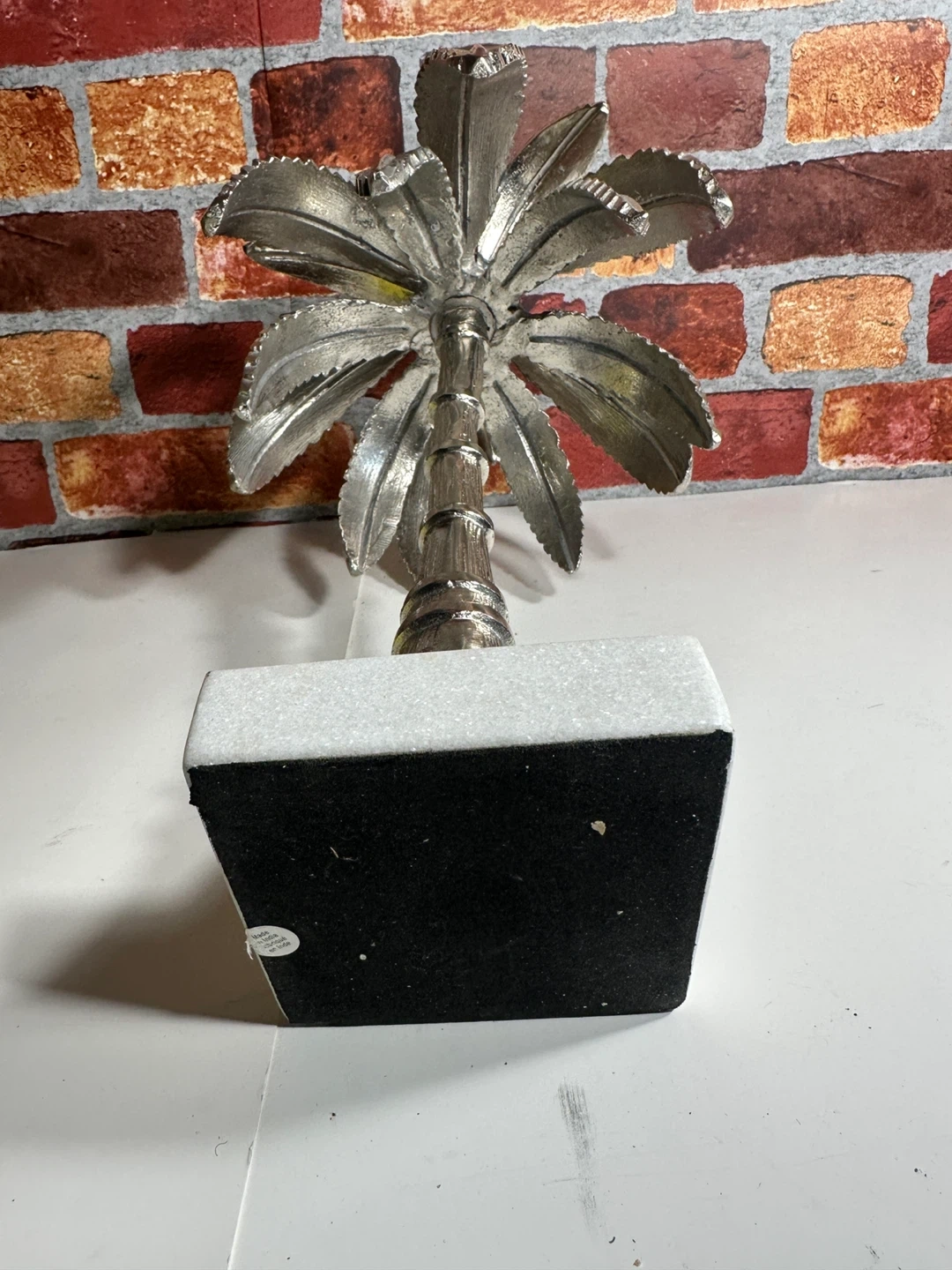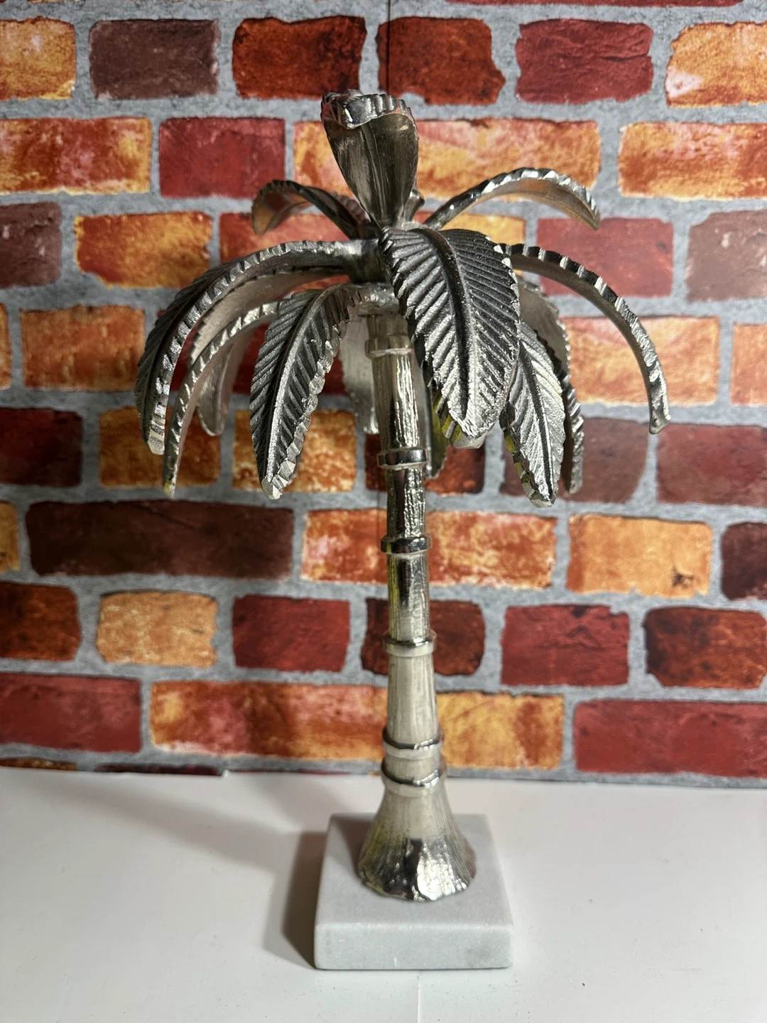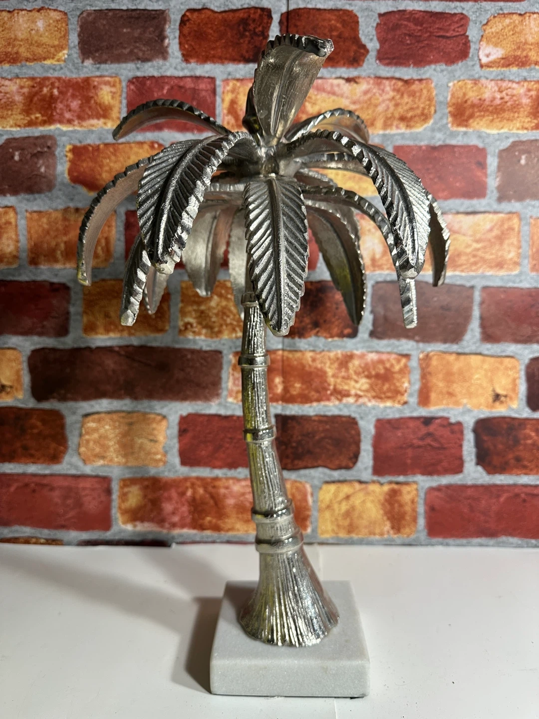 Decorative palm tree sculpture. It's made of a silver-toned metal with detailed leaves and trunk. It rests on a solid white marble base. Adds a touch of tropical flair to any space!