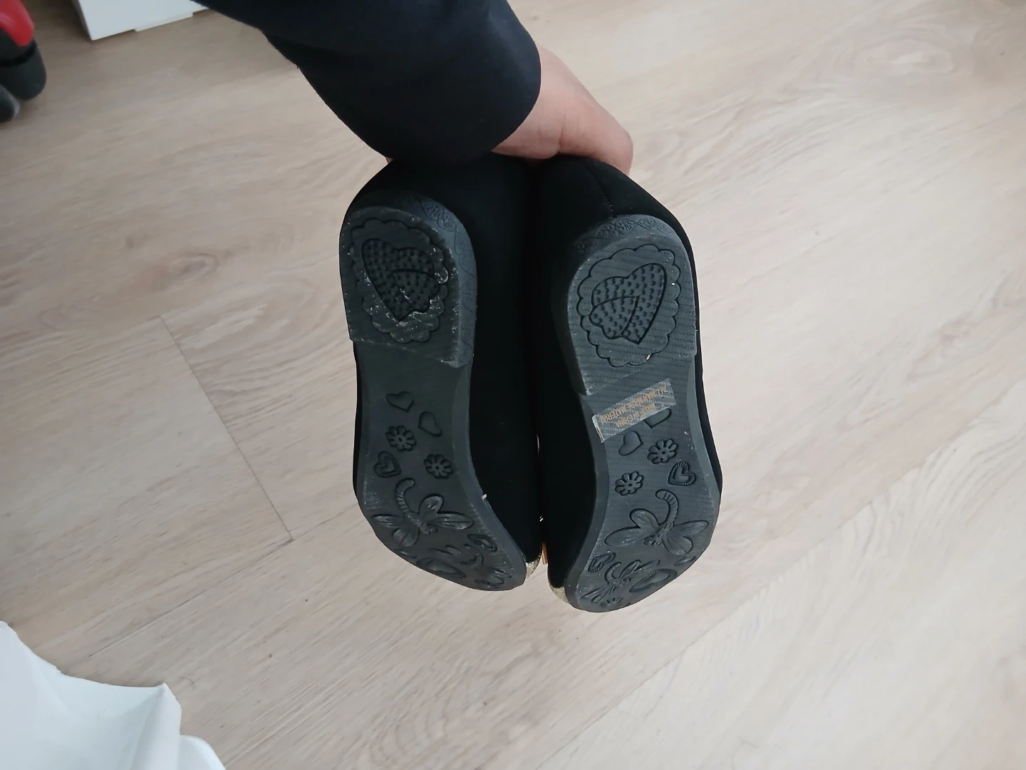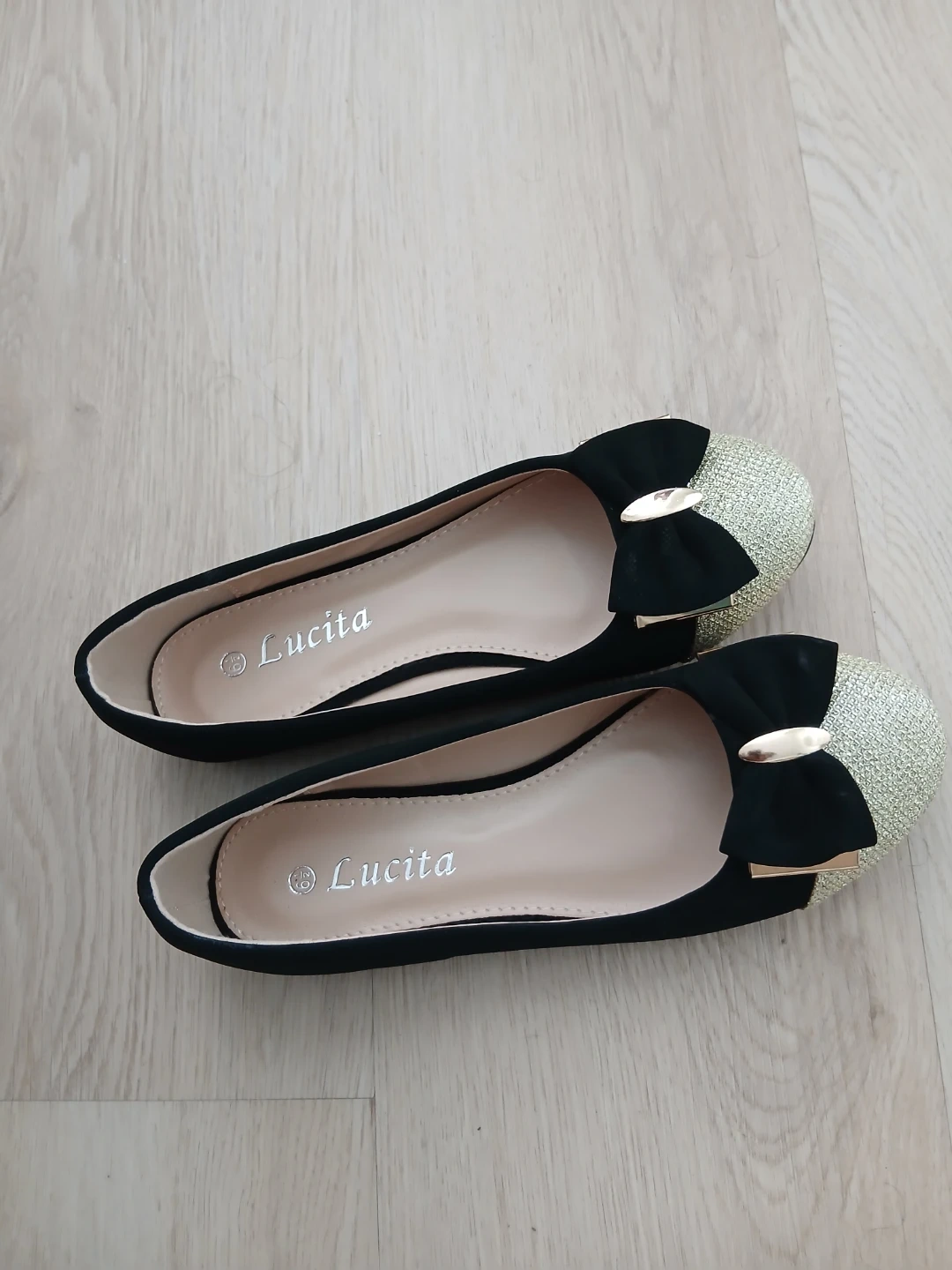 Cute black ballet flats with a sparkly gold toe cap and a bow detail. They're made with a soft black material and feature a comfortable sole. Perfect for adding a touch of glam to your everyday outfits!