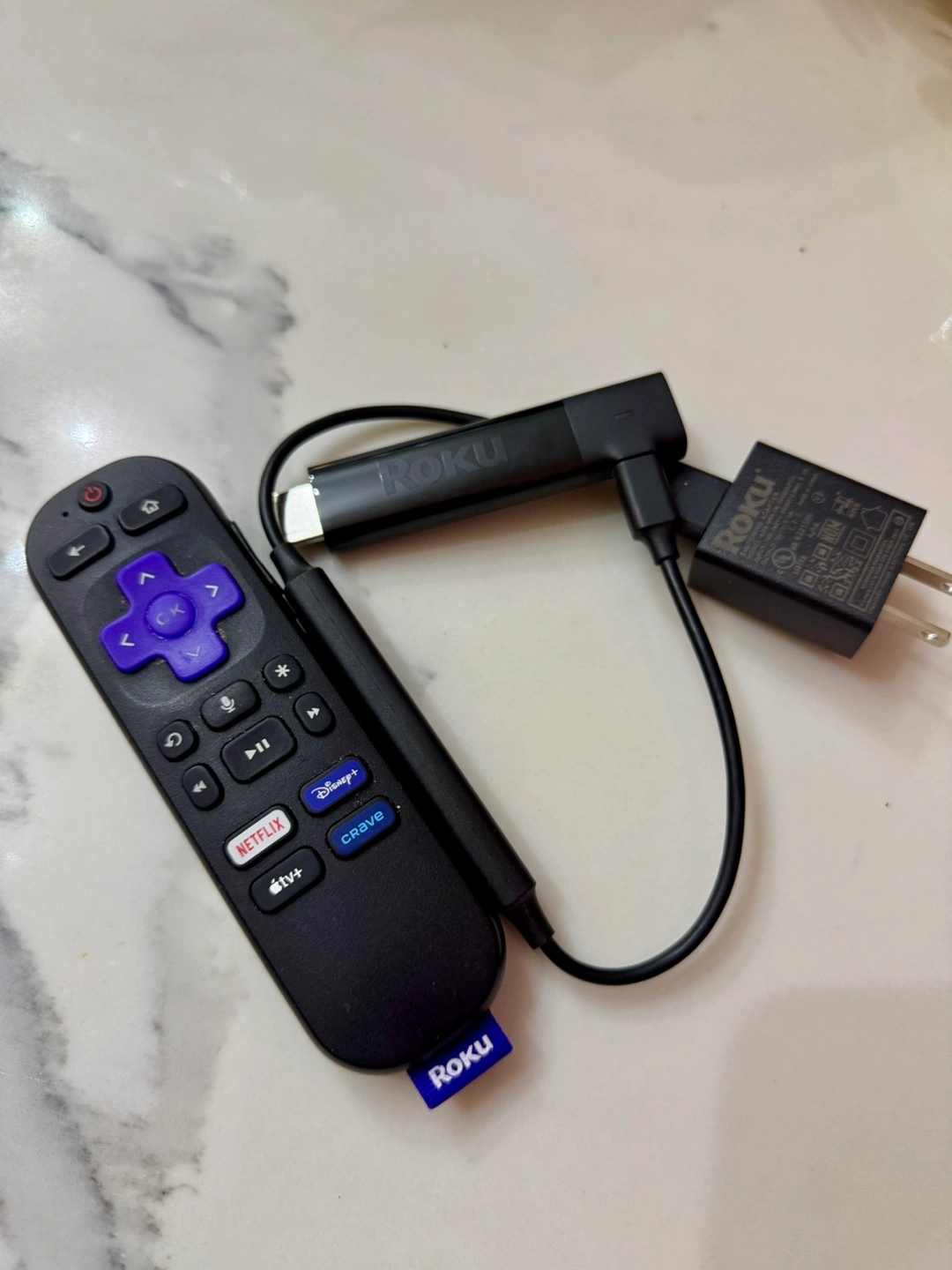 Streaming stick with remote. Includes power adapter and cable.