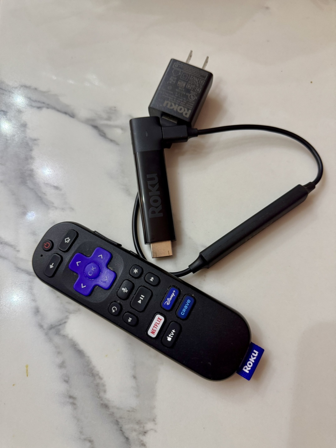 Streaming stick with remote. Includes power adapter and cable.
