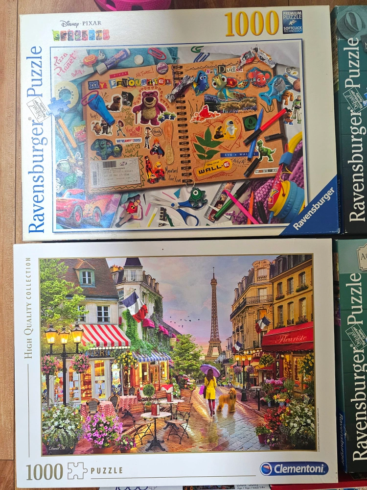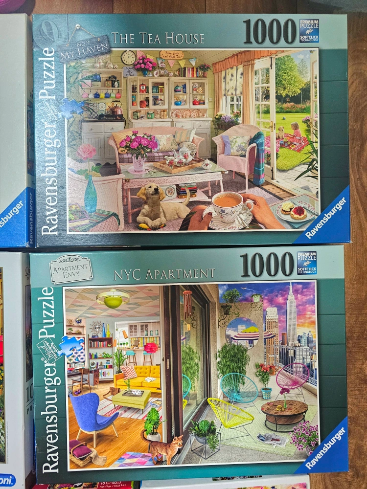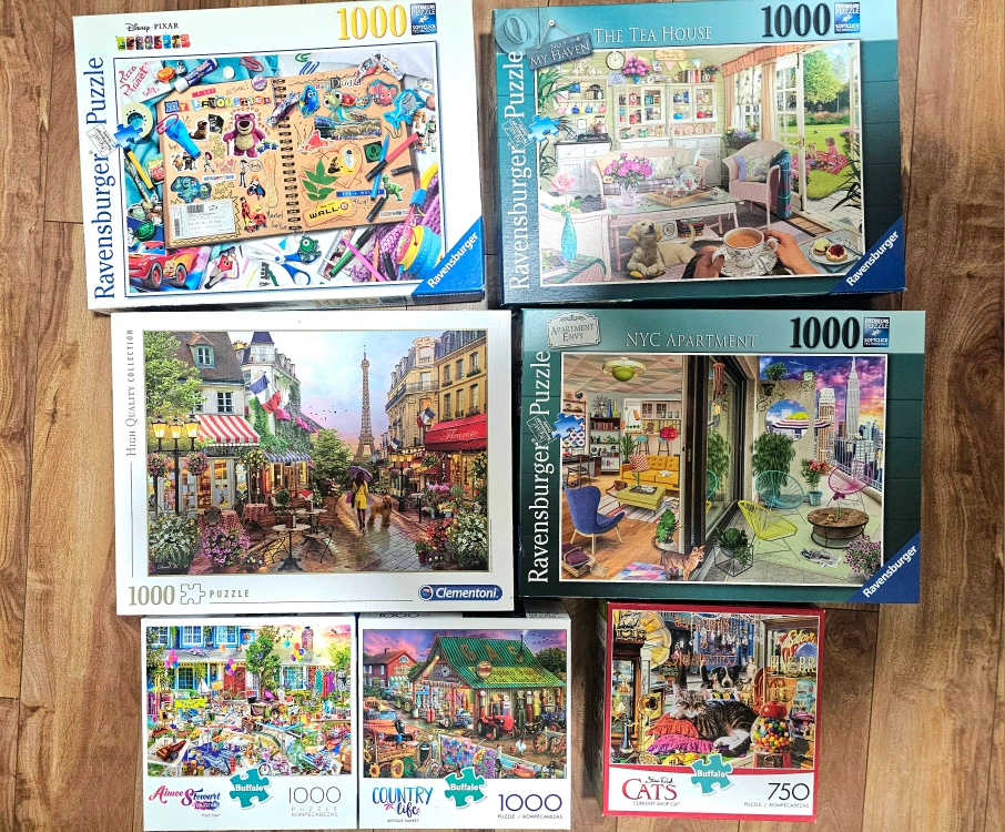 Selling a collection of jigsaw puzzles! There's a variety of brands including Ravensburger, Buffalo, and Clementoni. The puzzles range in piece count from 750 to 1000.