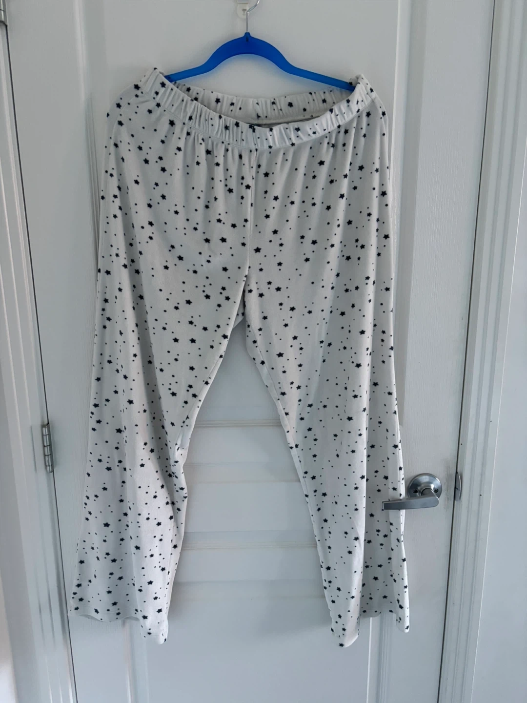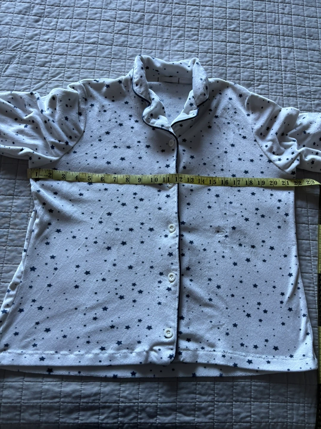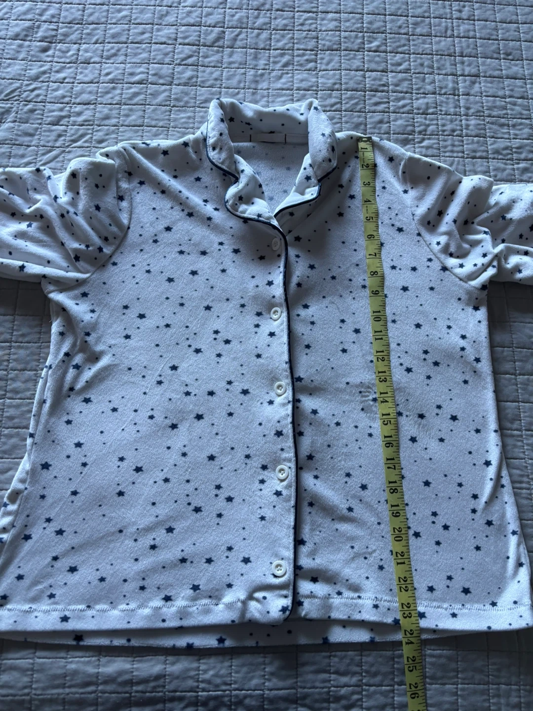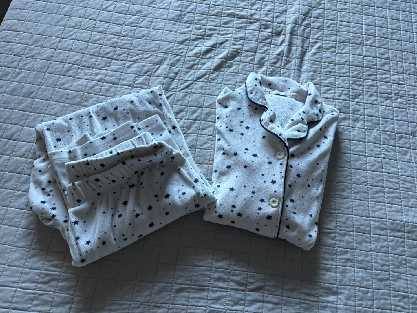 This is a two-piece pajama set featuring a long-sleeved top and matching pants. The set is white with a dark blue star pattern. The top has a collared neckline and buttons down the front. It's made of soft fabric for comfort.
