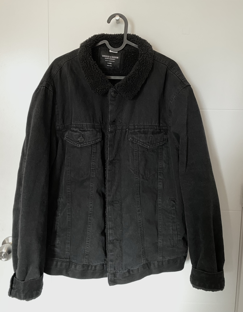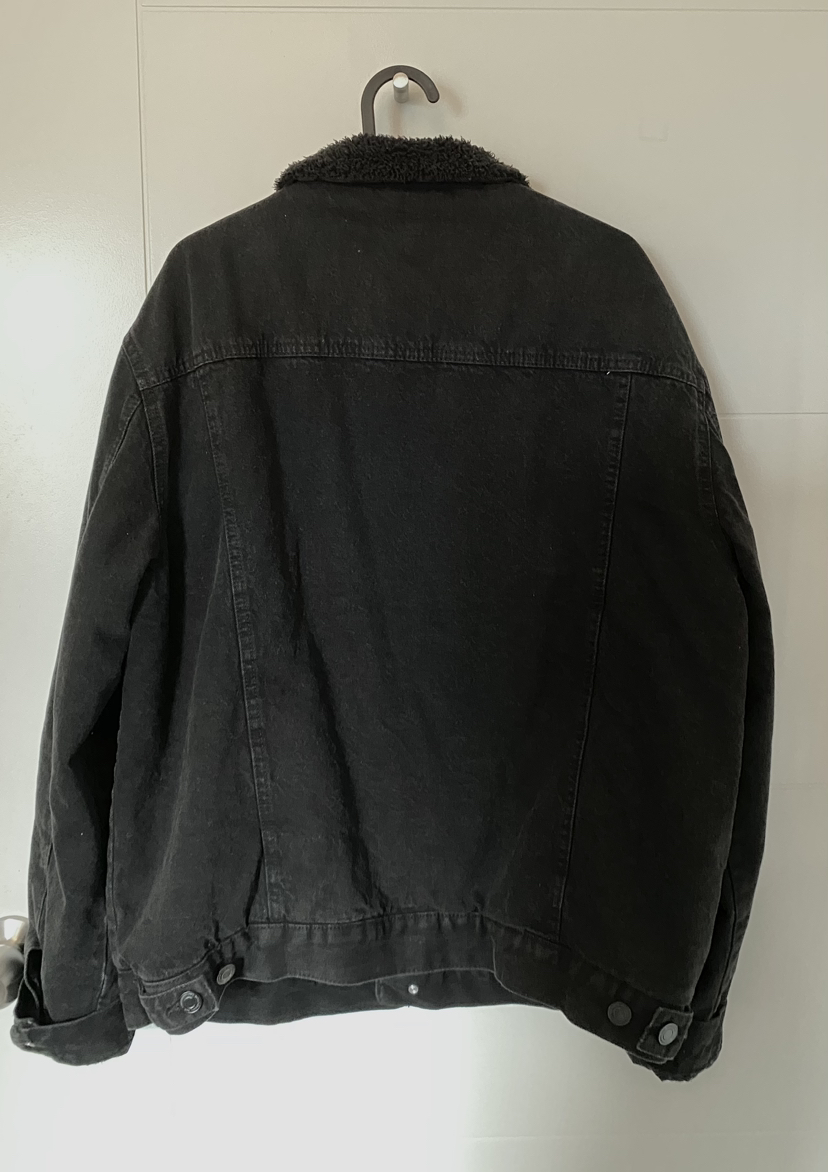 I'm selling this denim jacket, with sherpa material inside, wore a few times, the size is Large but fits more like Medium