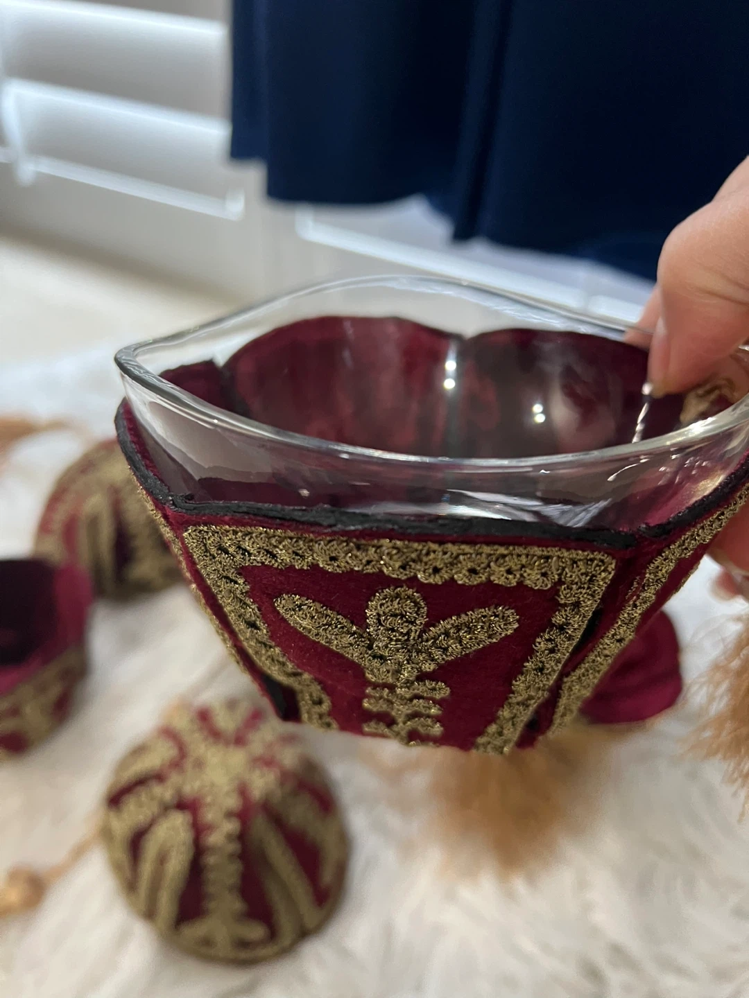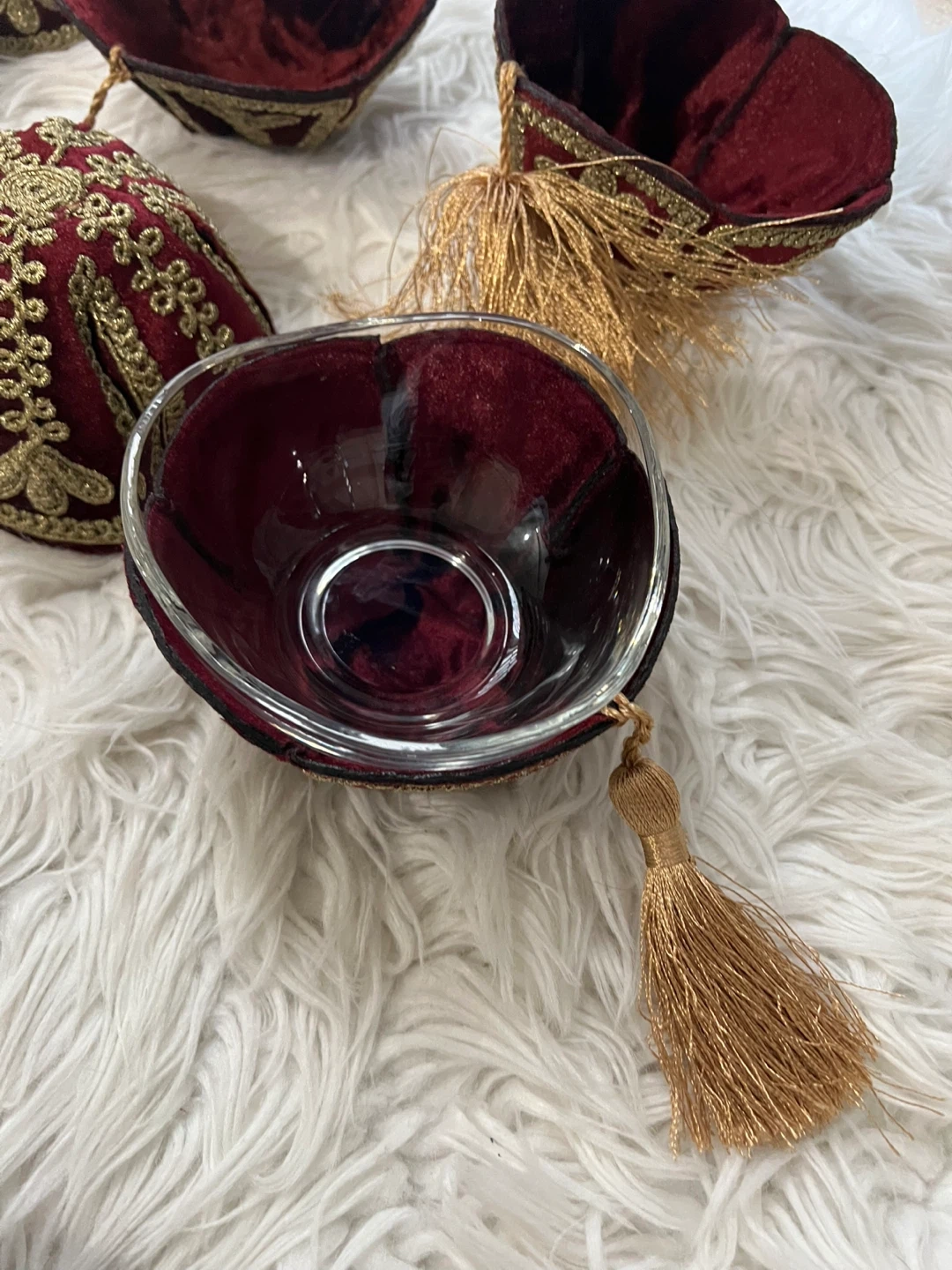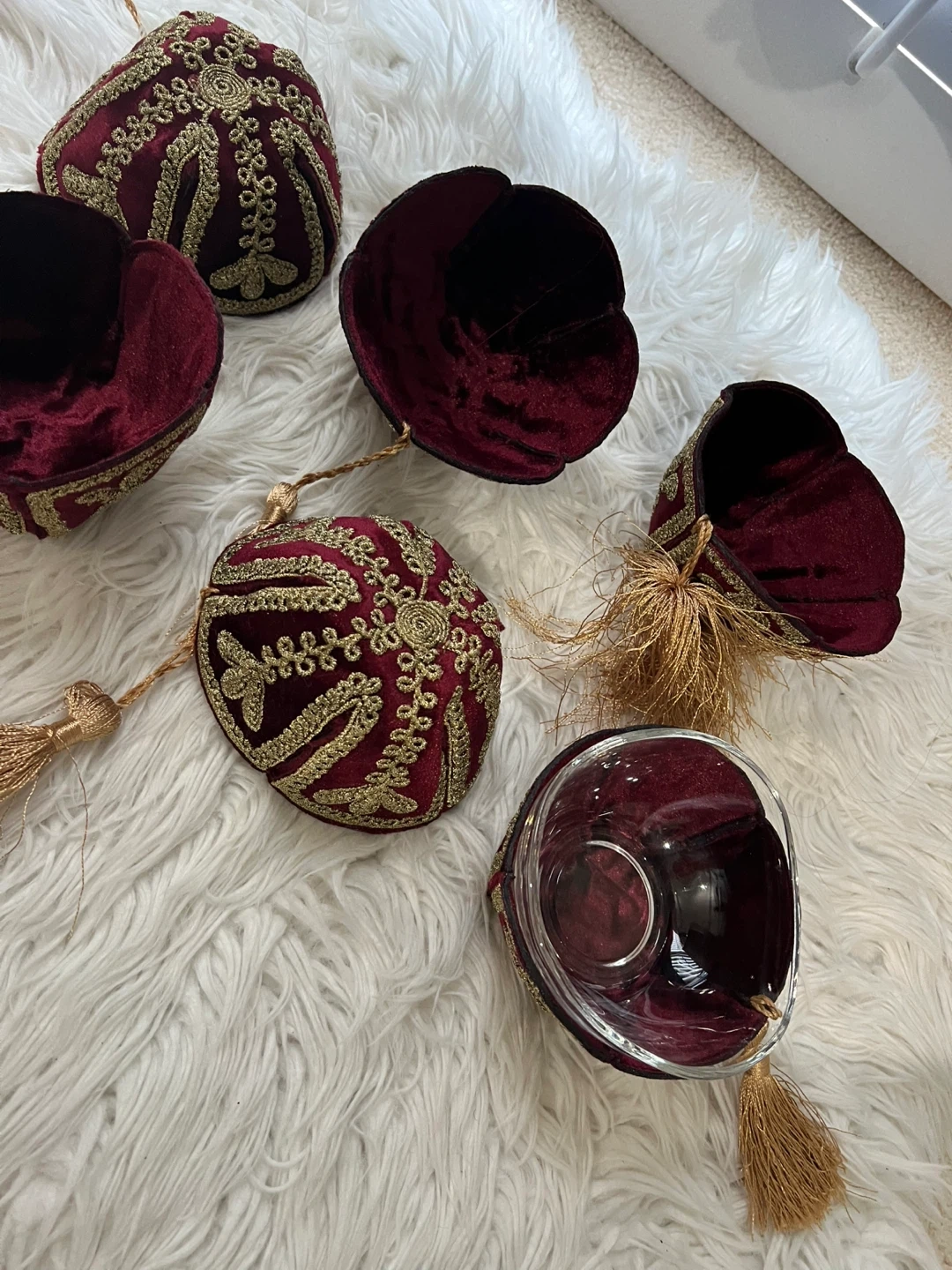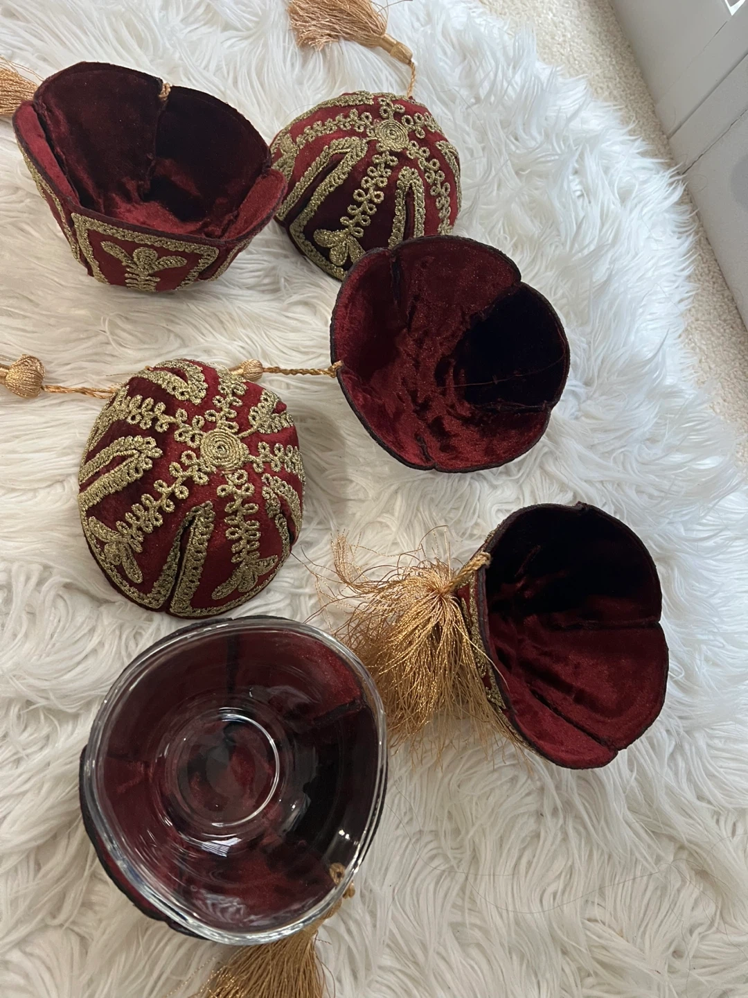 Selling a set of decorative gold trays with maroon cushions. They have a beautiful embroidered design and tassels. Perfect for adding a touch of elegance to your home decor!