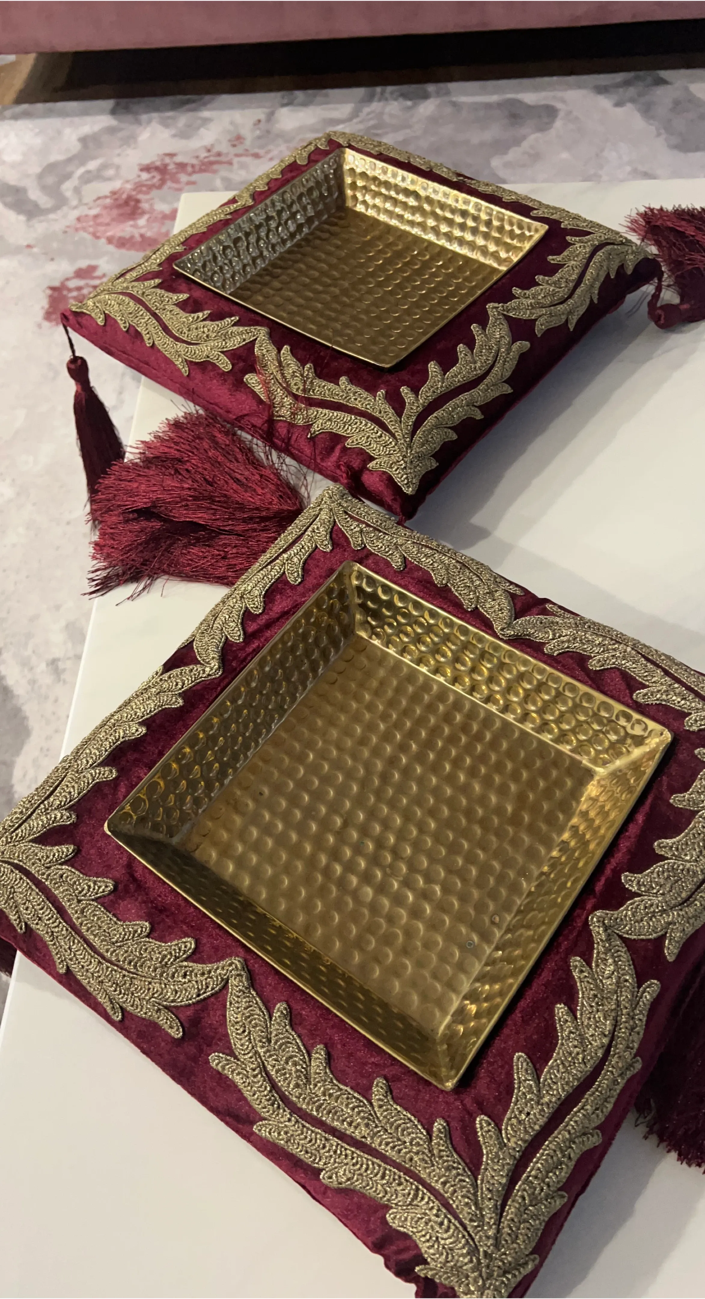 Selling a set of decorative gold trays with maroon cushions. They have a beautiful embroidered design and tassels. Perfect for adding a touch of elegance to your home decor!