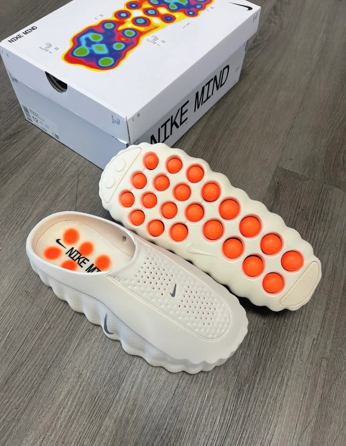 Nike Mindcrawlers mules are here! These slip-on shoes feature a unique textured sole with orange nubs for grip. Available in black and white.