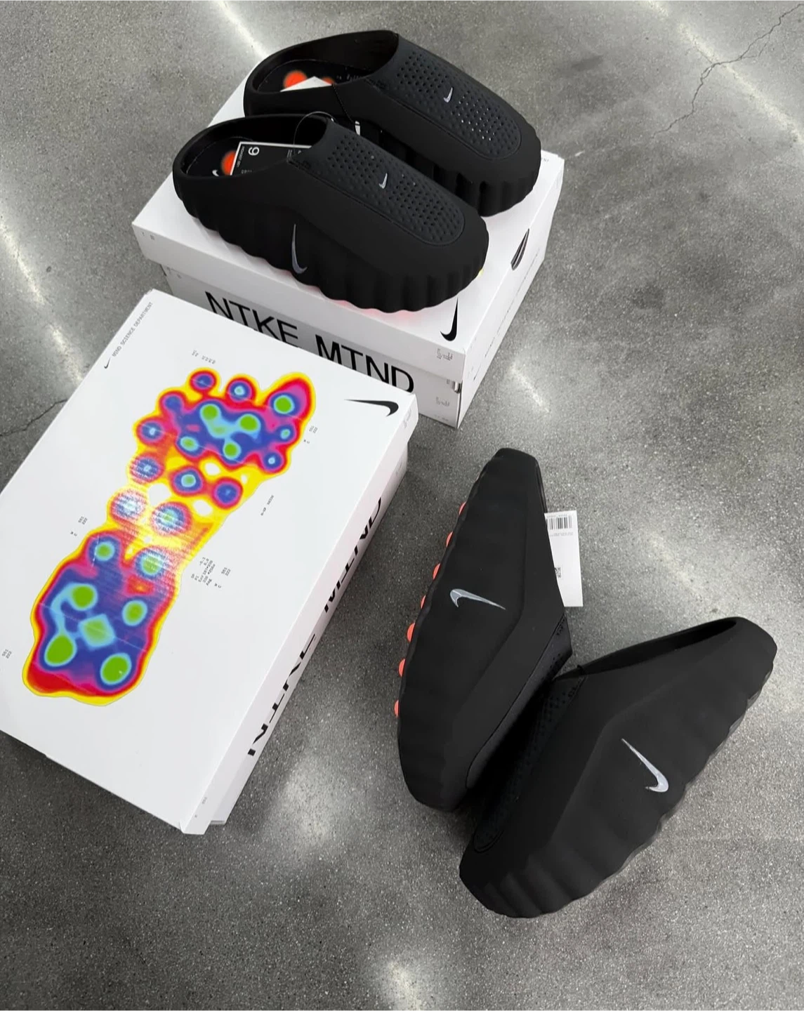 Nike Mindcrawlers mules are here! These slip-on shoes feature a unique textured sole with orange nubs for grip. Available in black and white.