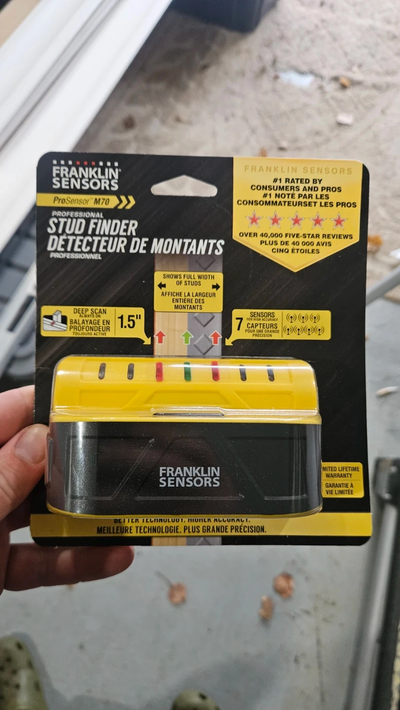 This is a Franklin Sensors ProSensor M70 professional stud finder. It features deep scan functionality and shows the full width of studs. It has 7 sensors for high accuracy.