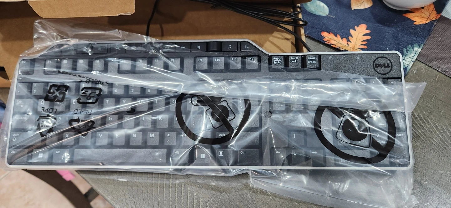 This is a Dell wired keyboard. It features a standard QWERTY layout with a full numeric keypad. It's still in its original plastic wrapping and box.
