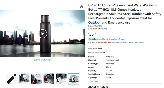Stay hydrated with peace of mind using the UVBRITE TT-B02, a sleek, insulated stainless-steel bottle equipped with UV-C light technology to eliminate up to 99.99% of microbes, mold, bacteria, and viruses. Perfect for outdoor adventures, emergencies, or daily use, this rechargeable bottle offers advanced purification at the push of a button. Key Features: 18.6 oz (550 ml) insulated stainless-steel construction Built-in UV-C light for self-cleaning & water purification Destroys bacteria and viruses with 99.99% effectiveness Rechargeable with built-in safety lock to prevent accidental exposure Modern black matte design—sleek, durable, and travel-friendly Get an additional $2 discount for each additional item purchased from my listing. For example, buy 2 items, get $2 off; buy 3 items, get $4 off, and so on!