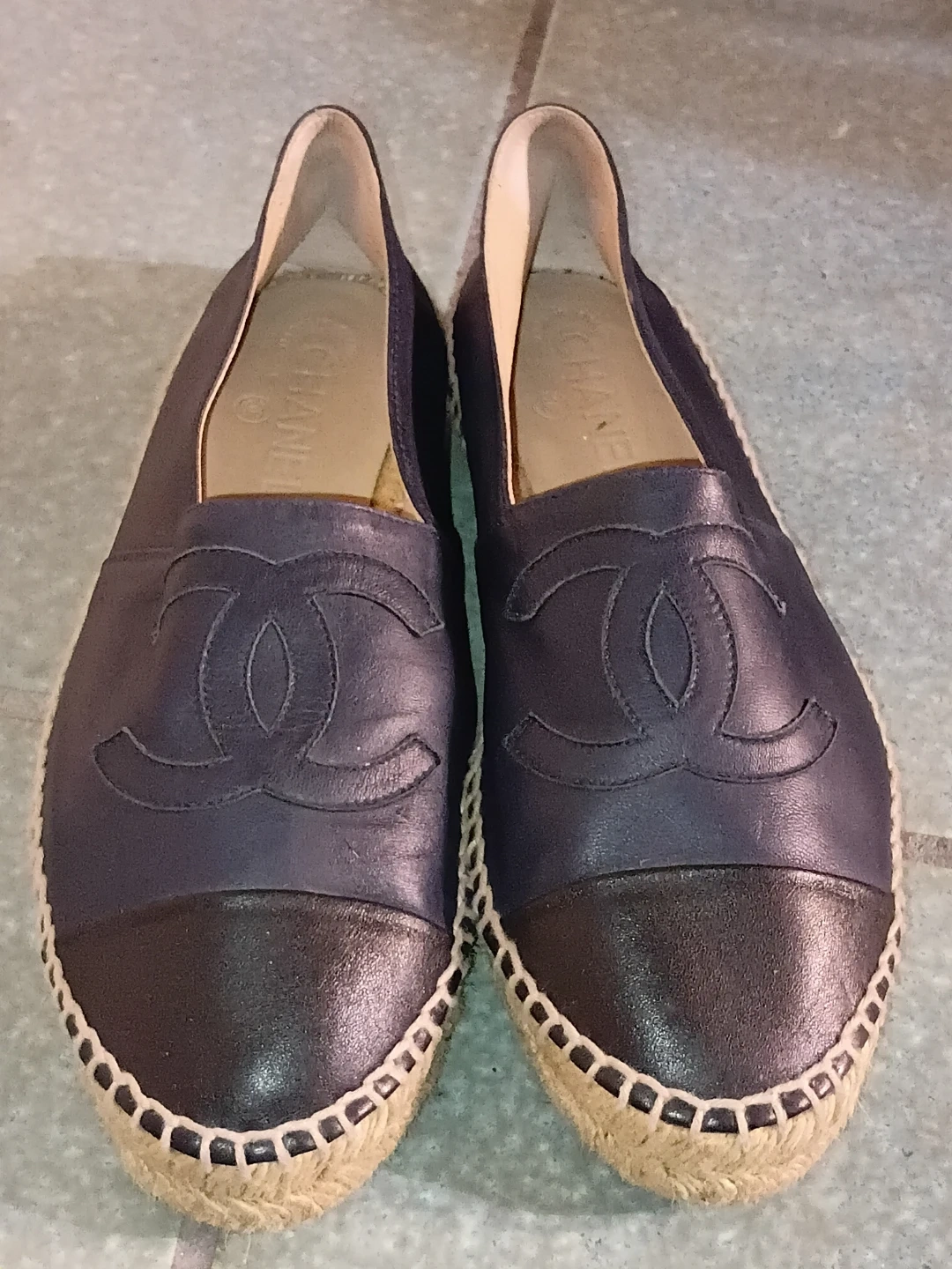 CHANEL Navy Leather Cap Toe Espadrille Flats