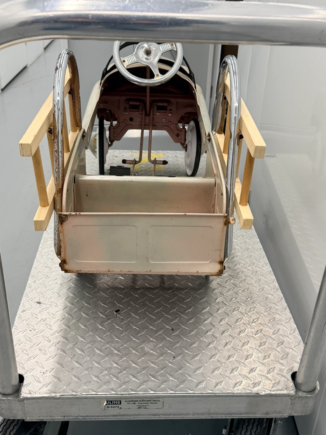 This is a vintage fire engine pedal car, marked 'Engine No. 7' and 'FIRE AND RESCUE'. It features wooden ladders on the sides and a working bell on the front. It has a metal body with some signs of wear, consistent with its age.