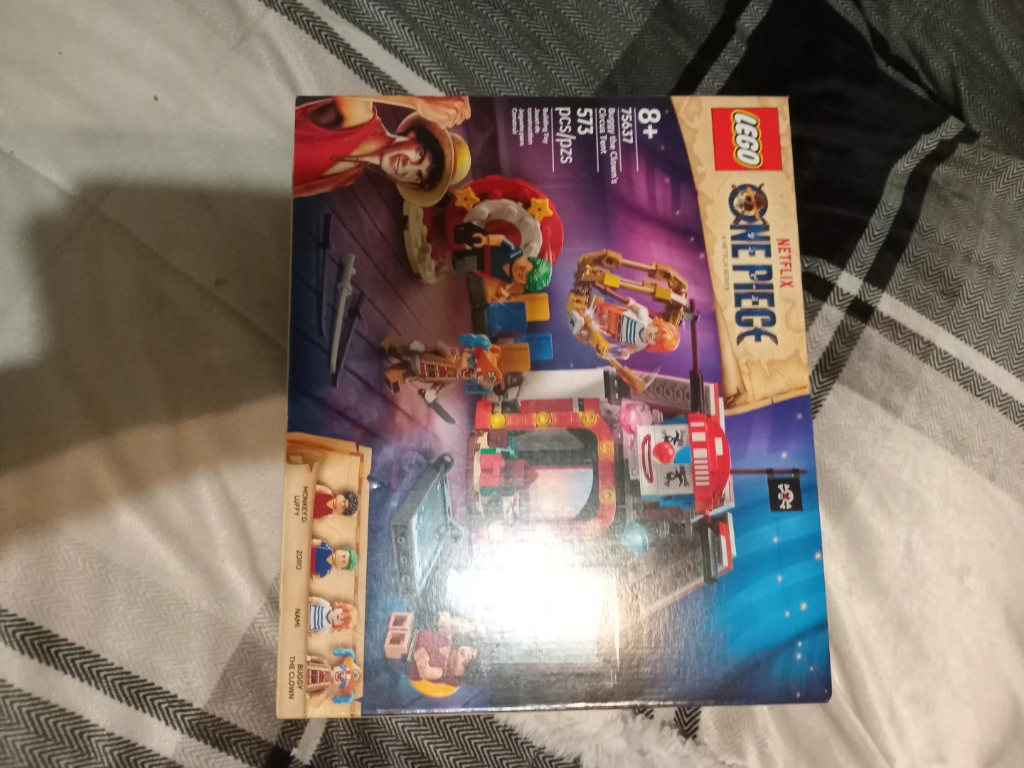 This is the LEGO One Piece Buggy the Clown's Circus Tent building set. It contains 573 pieces and includes characters like Monkey D. Luffy, Zoro, Nami, and Buggy the Clown. It's great for fans of the anime and Netflix series!