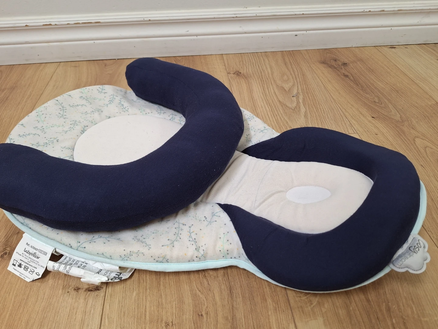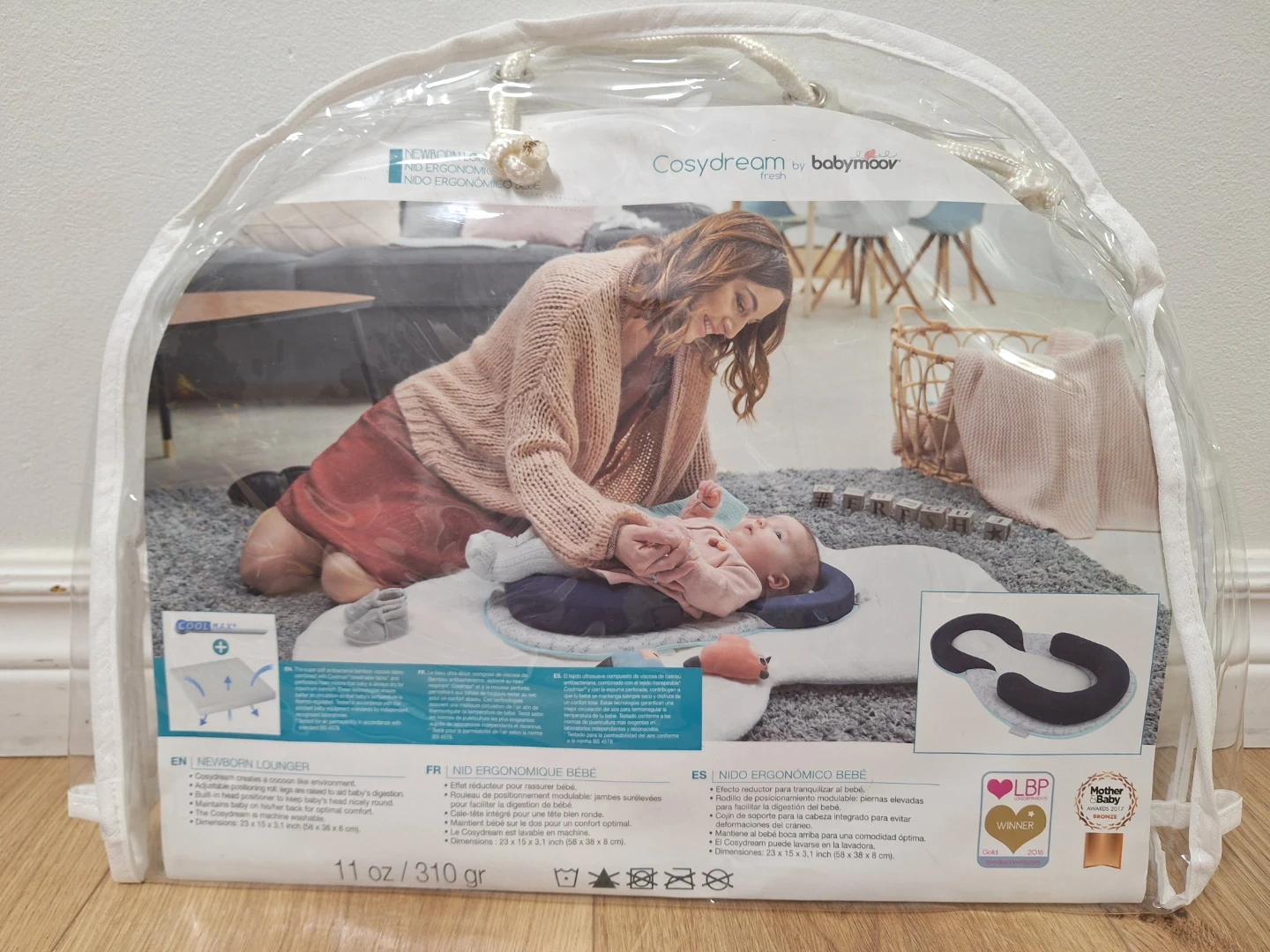 This is a Babymoov Cosydream Fresh newborn lounger. It's made with soft and breathable material and has a built-in head support. The lounger is designed to help with digestion and keep baby's head nicely round.