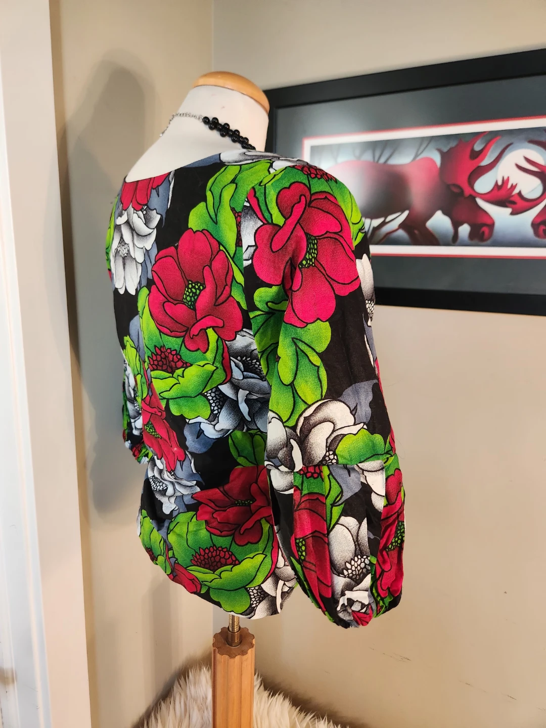 A colourful wrap-style top with a vibrant floral print. Features full, gathered sleeves and a tie waist detail. Made from a lightweight cotton fabric. Size 6/8