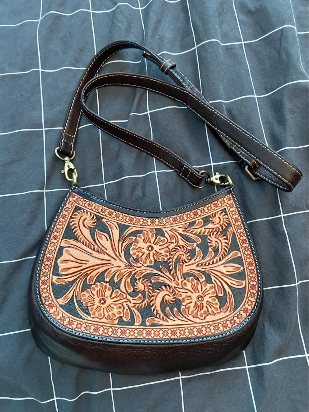 Selling a lovely Myra Bag leather bag! It features a beautiful floral tooled design and a dark brown leather finish. The bag has an adjustable strap and is in great condition. Perfect for adding a touch of rustic charm to any outfit