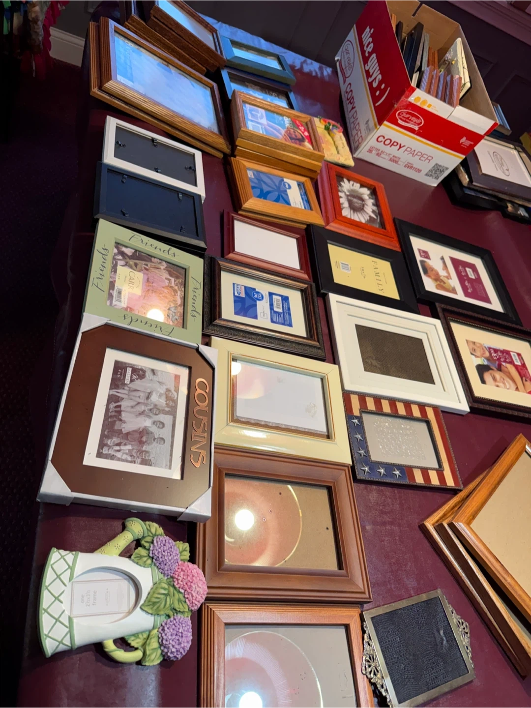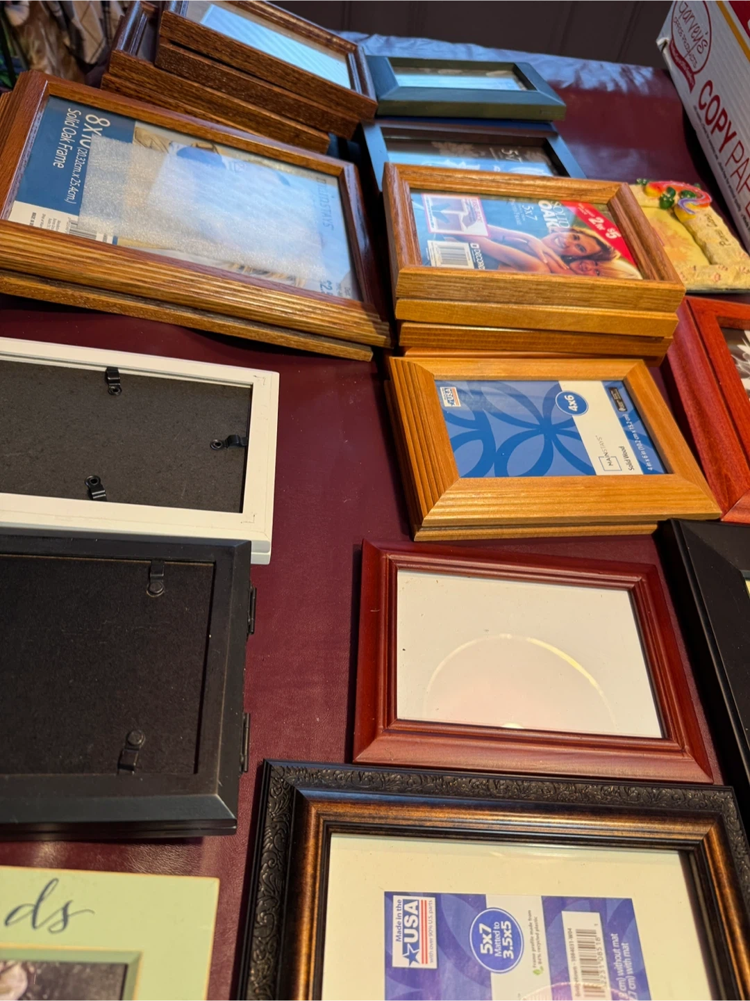 A collection of various picture frames. Includes different sizes and materials like wood and plastic. Some frames have labels indicating sizes like 5x7 inches and 8x10 inches. Great for displaying your cherished memories!
