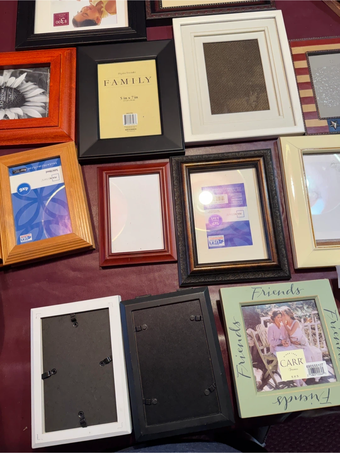 A collection of various picture frames. Includes different sizes and materials like wood and plastic. Some frames have labels indicating sizes like 5x7 inches and 8x10 inches. Great for displaying your cherished memories!