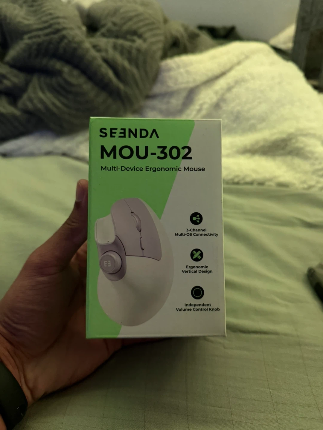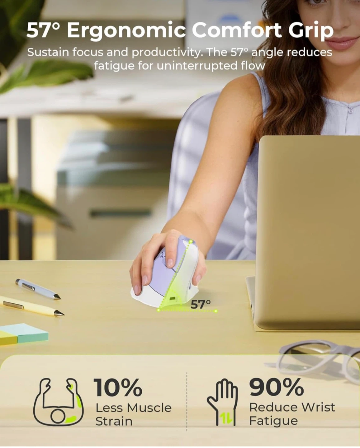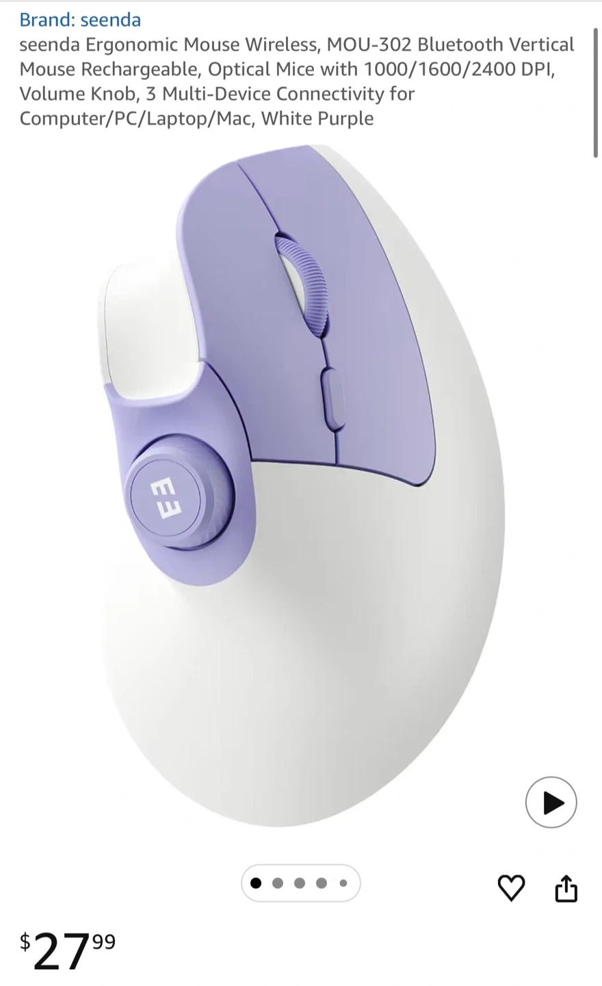 It's a Seenda MOU-302 ergonomic mouse in white and purple. Features 3-channel multi-OS connectivity and an independent volume control knob. The vertical design helps reduce wrist fatigue and muscle strain.
