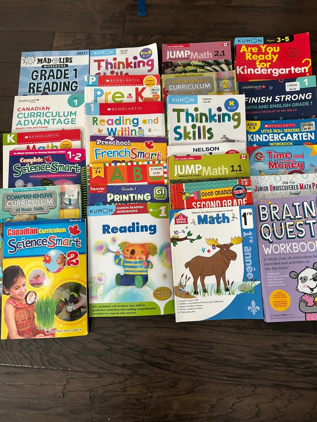 This lot includes various educational workbooks for different grade levels and subjects. Subjects covered include reading, writing, math, science, and thinking skills. Brands featured are Kumon, Scholastic, Jump Math, and others. These books are great for supporting your child's learning at home.