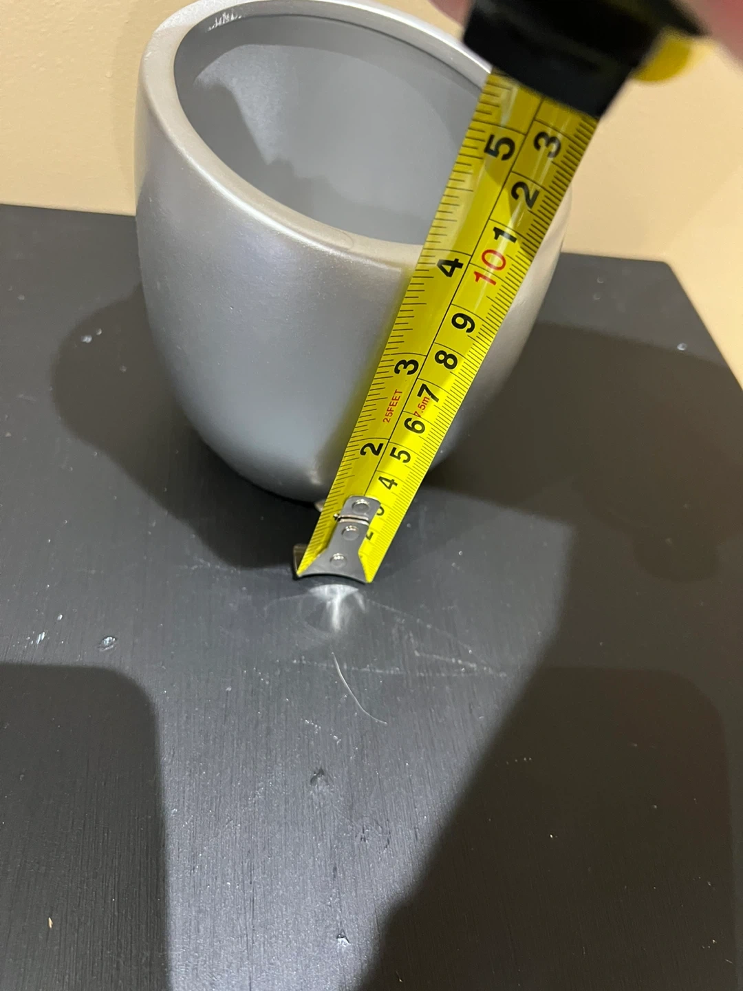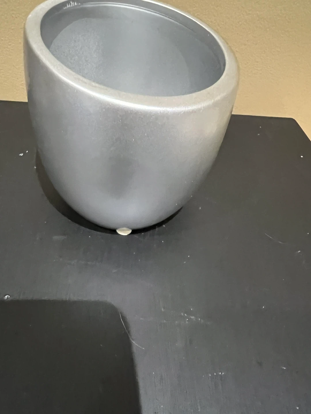This is a silver planter pot with a modern design. It measures approximately 5 inches in diameter and 6 inches in height. Its sleek look makes it a nice addition to any home décor.