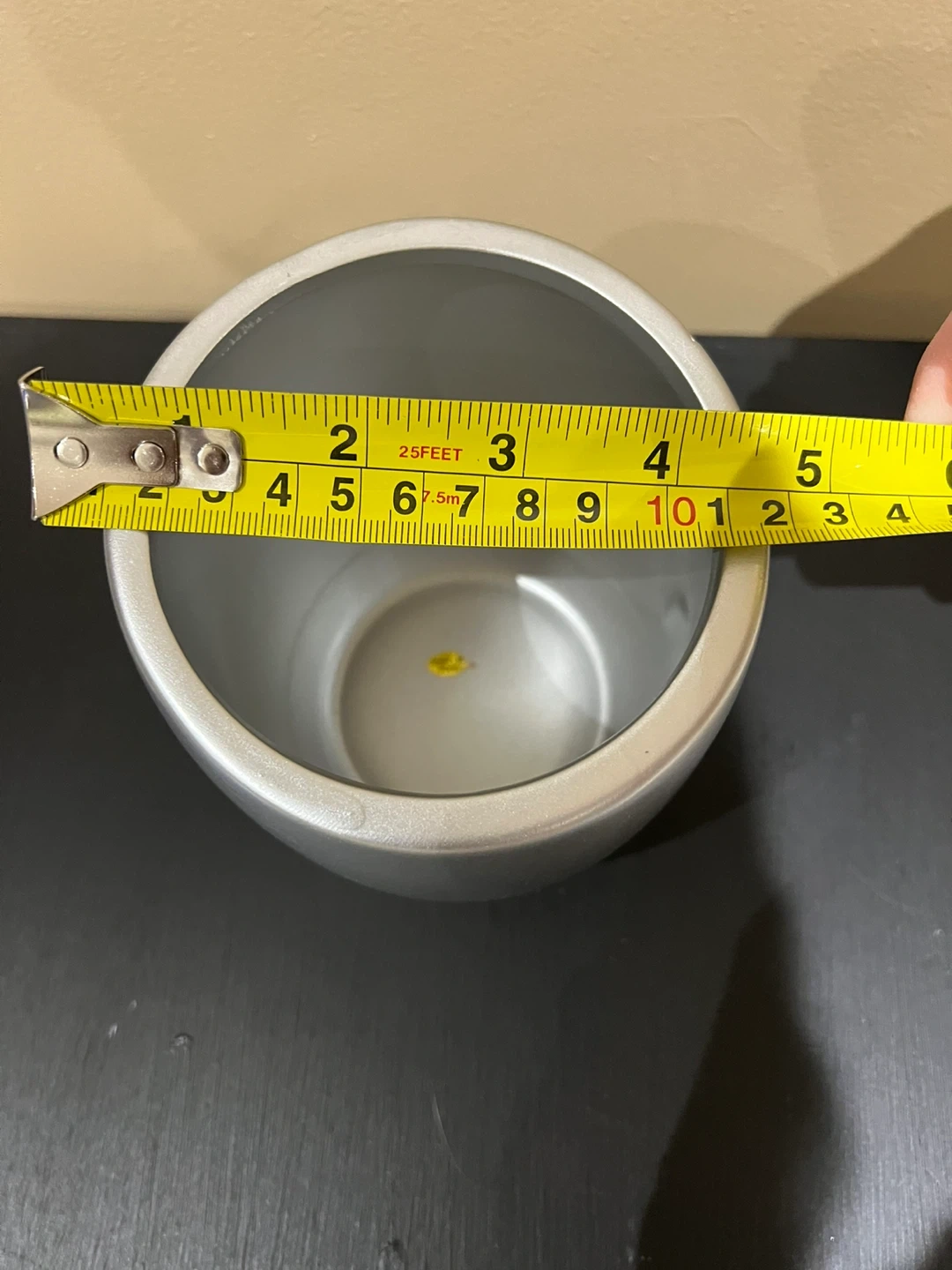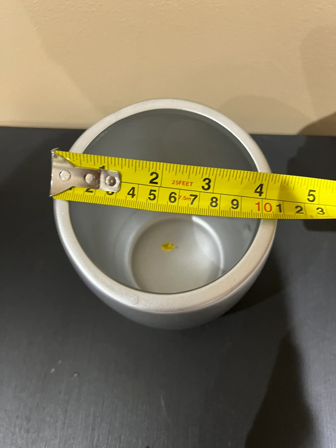 This is a silver planter pot with a modern design. It measures approximately 5 inches in diameter and 6 inches in height. Its sleek look makes it a nice addition to any home décor.