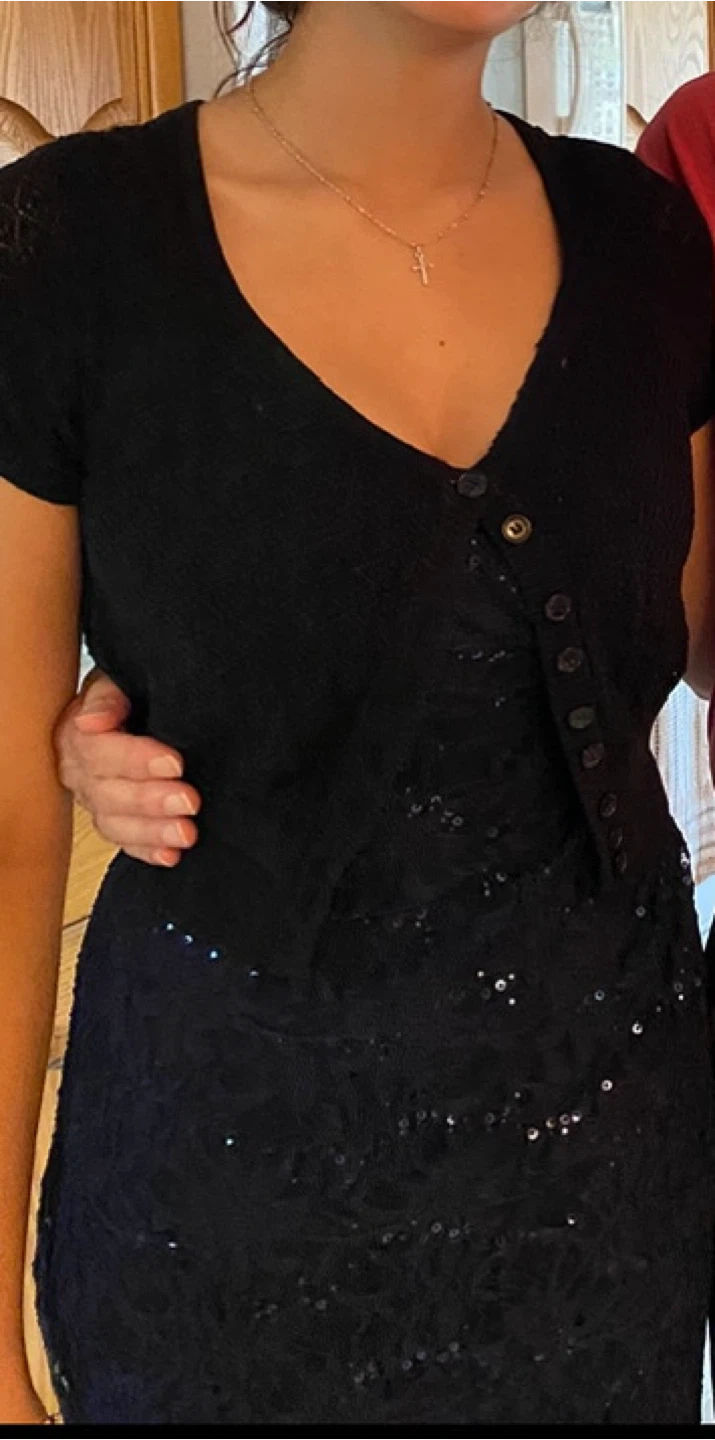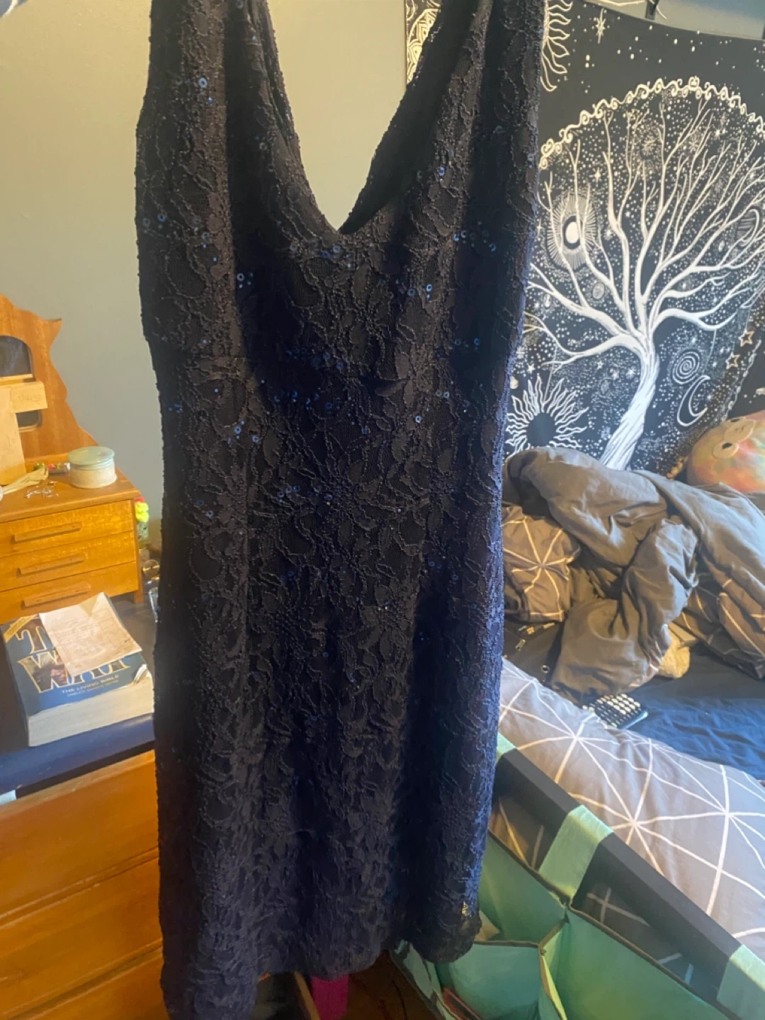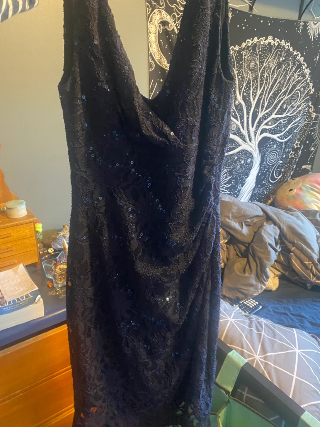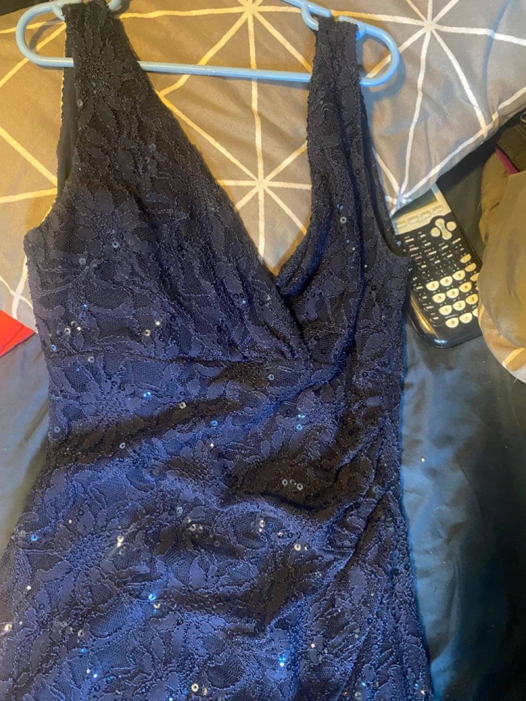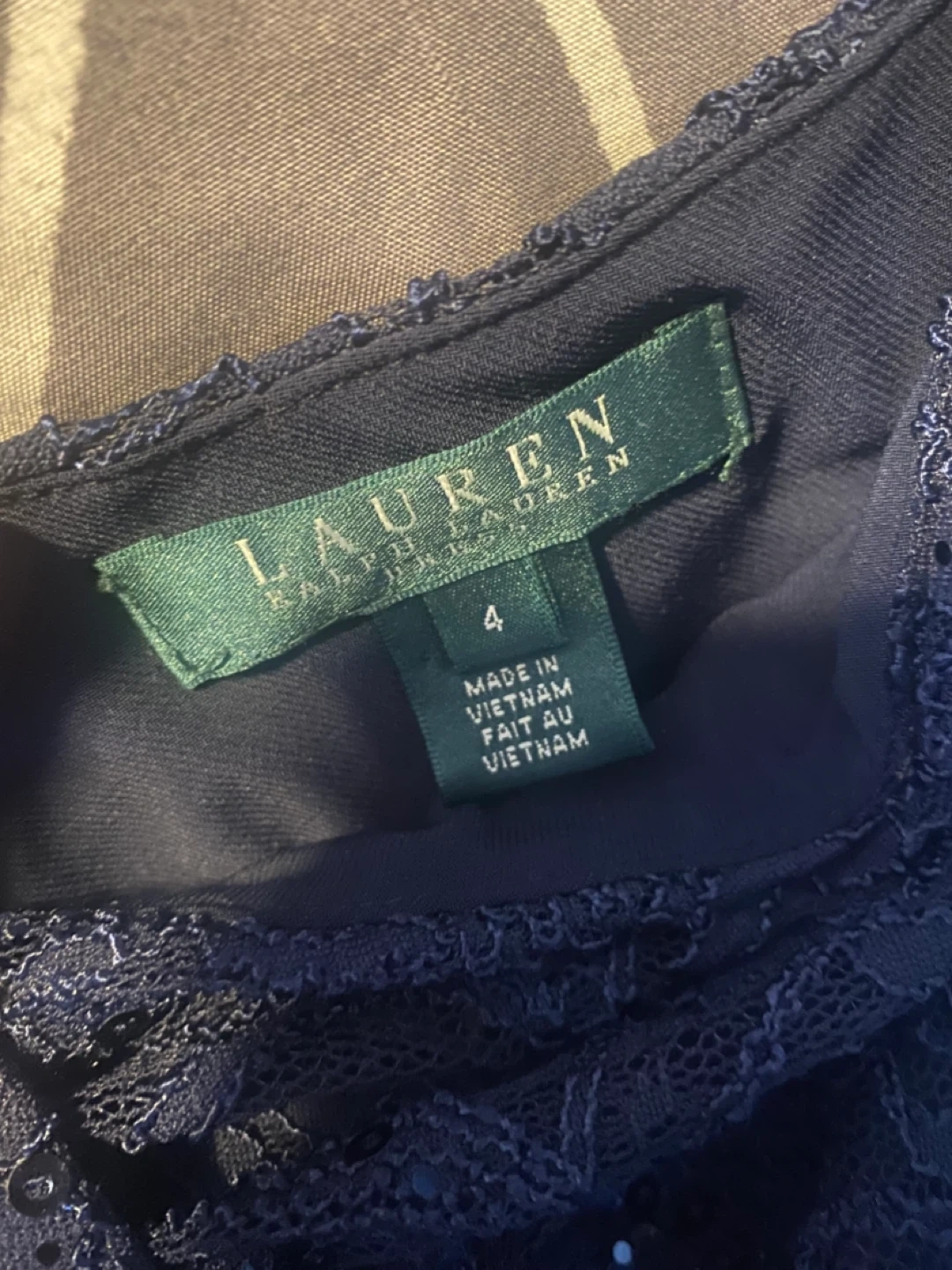 Hate to see this one go, I adore this dress but it is now a bit tight on me. This is a gorgeous navy blue size 4 Ralph Lauren dress. Perfect sequence design all over, the neckline, wore it a couple of times, it’s like new. Length is to the knee.