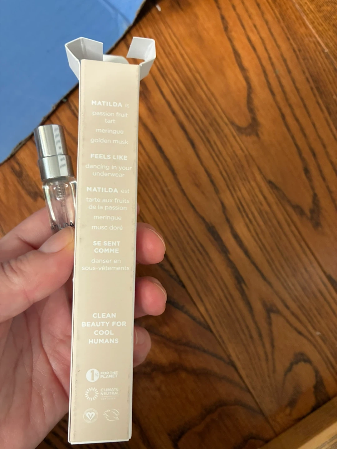 This is the Matilda by Rosie Jane eau de parfum in a travel-friendly spray. It's a vegan, cruelty-free formula made in the US. Fragrance notes include passion fruit tart, meringue, and golden musk.